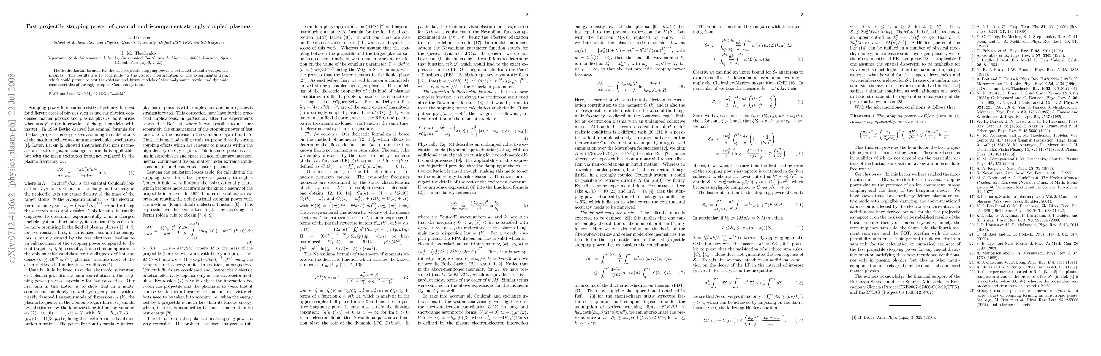 This research extends the Bethe-Larkin formula to multi-component strongly coupled plasmas to enhance the understanding of fast projectile stopping power, aiming to better interpret experimental data and validate models of thermodynamic and dynamic characteristics of such systems.