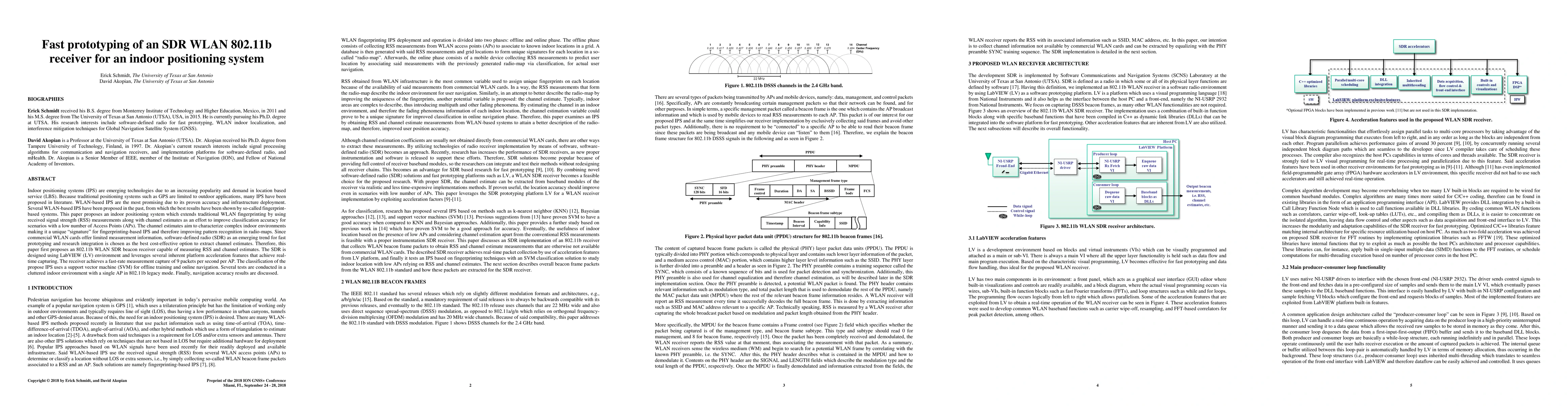This paper proposes an indoor positioning system using an SDR-based 802.11b WLAN receiver to enhance fingerprint-based positioning by incorporating received signal strength and channel estimates. The system leverages LabVIEW for real-time signal processing and achieves 9 packets per second per AP, utilizing SVM for classification.
