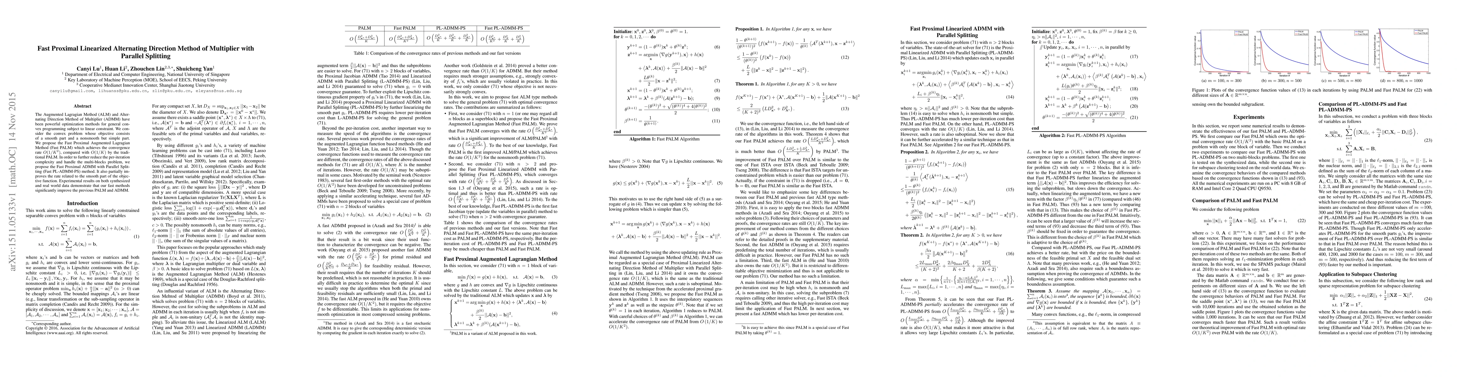 The Fast Proximal Augmented Lagragian Method (Fast PALM) and Fast Proximal ADMM with Parallel Splitting (Fast PL-ADMM-PS) achieve $O(1/K^2)$ convergence compared to $O(1/K)$ of traditional methods, significantly improving optimization efficiency for convex problems with smooth and nonsmooth parts. Experimental results show substantial performance gains over previous PALM and ADMM methods.