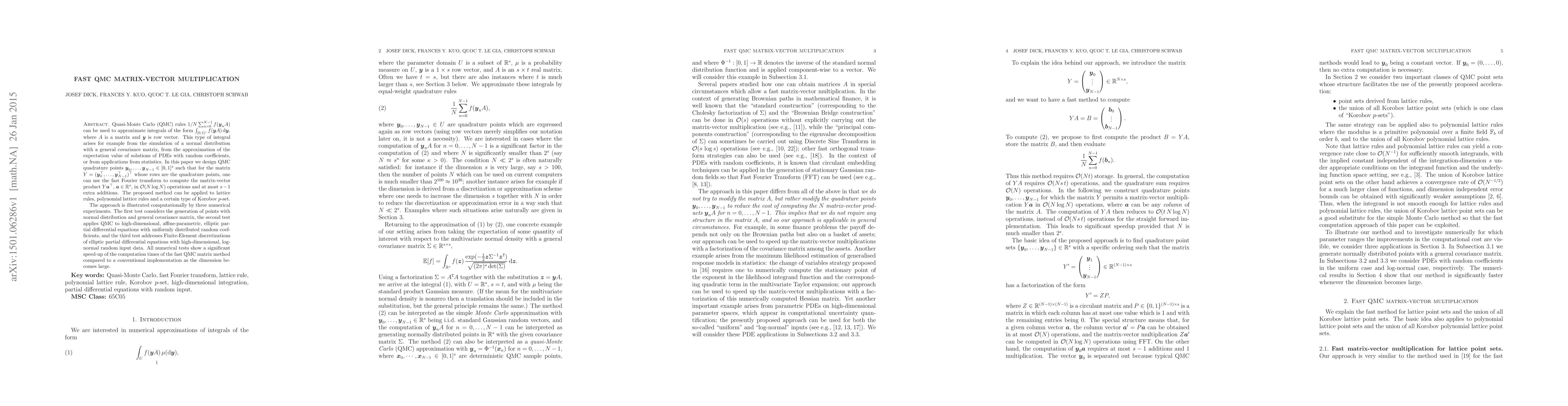This paper proposes a fast method for Quasi-Monte Carlo (QMC) matrix-vector multiplication using the fast Fourier transform, achieving $\mathcal{O}(N \log N)$ operations. The method is demonstrated to significantly speed up computations for high-dimensional problems in statistics, PDEs, and finite element methods compared to conventional implementations.