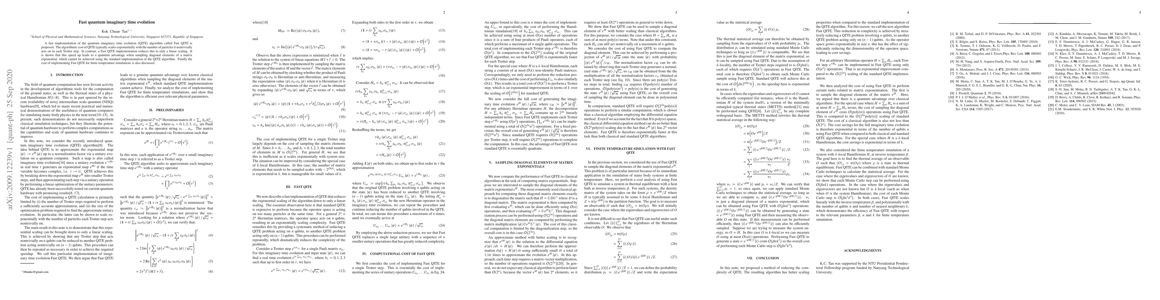 A fast implementation of the quantum imaginary time evolution (QITE) algorithm called Fast QITE is proposed. The algorithmic cost of QITE typically scales exponentially with the number of particles it nontrivially acts on in each Trotter step. In contrast, a Fast QITE implementation reduces this to only a linear scaling. It is shown that this speed up leads to a quantum advantage when sampling diagonal elements of a matrix exponential, which cannot be achieved using the standard implementation of the QITE algorithm. Finally the cost of implementing Fast QITE for finite temperature simulations is also discussed.