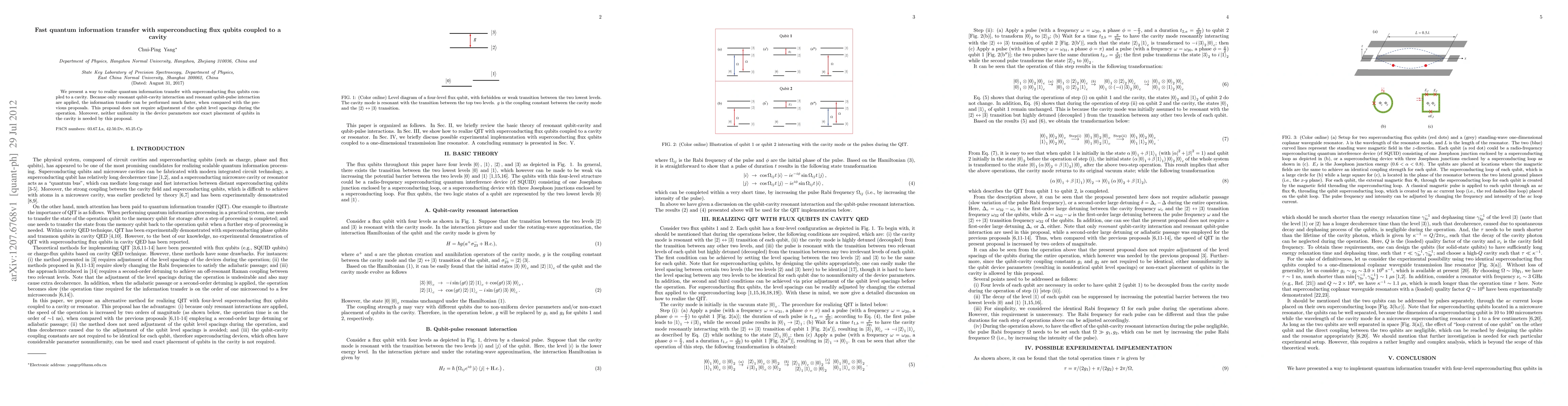 This paper proposes a method for fast quantum information transfer using superconducting flux qubits coupled to a cavity, achieving faster speeds than previous methods without requiring adjustments to qubit spacings or precise uniformity in device parameters.