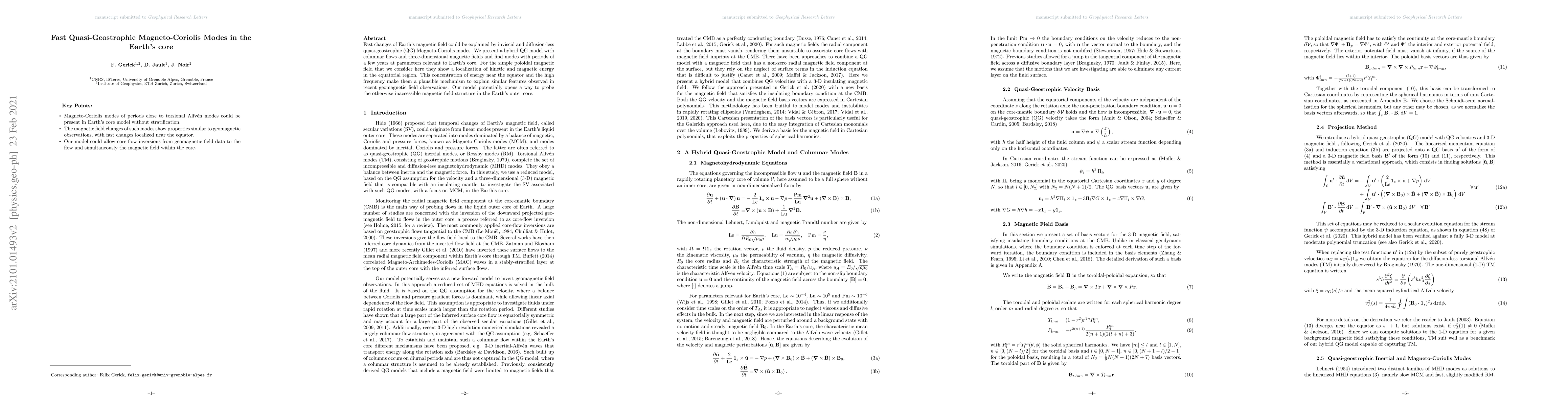 This paper proposes a hybrid quasi-geostrophic Magneto-Coriolis model to explain rapid changes in Earth's magnetic field, identifying localized, high-frequency modes in the equatorial region that could account for recent geomagnetic observations. The model suggests a new method for probing the magnetic field structure in Earth's outer core.