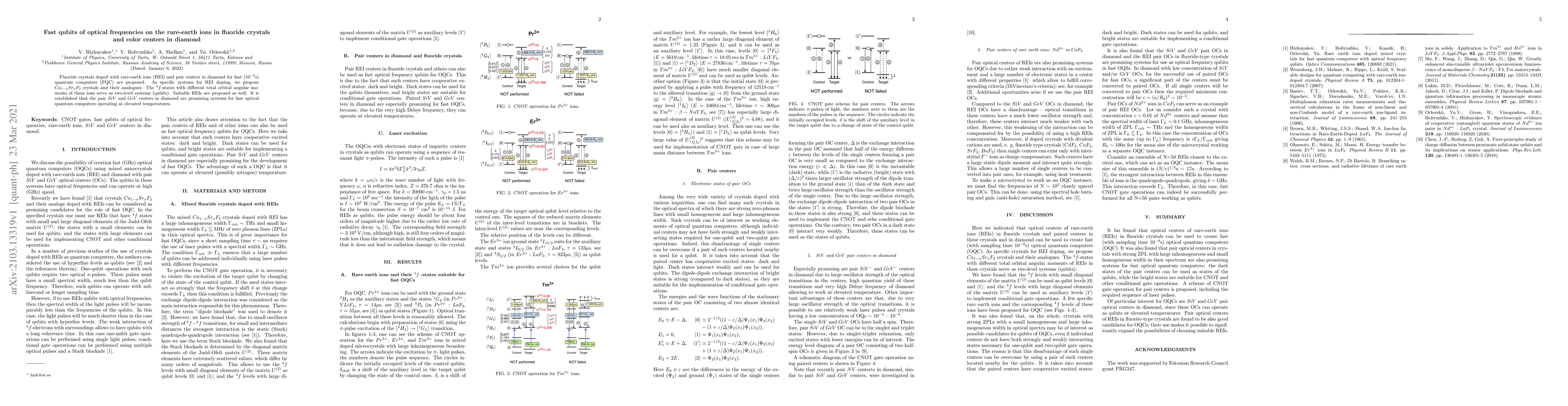 This paper proposes fluoride crystals doped with rare-earth ions and color centers in diamond as fast qubits for quantum computers operating at optical frequencies. Specifically, $Ca_{1-x}Sr_{x}F_{2}$ crystals and $SiV$ and $GeV$ centers in diamond are highlighted as promising systems for quantum computing at $10^{-9}$ seconds timescales.