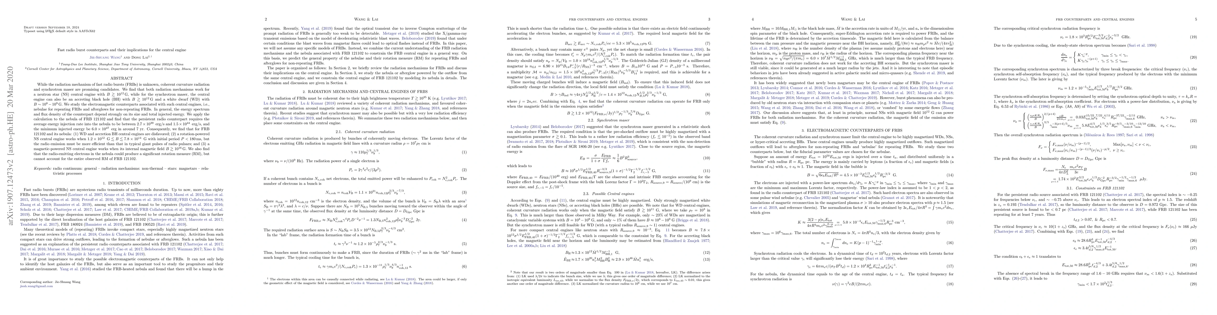 While the radiation mechanism of fast radio bursts (FRBs) is unknown, coherent curvature radiation and synchrotron maser are promising candidates. We find that both radiation mechanisms work for a neutron star (NS) central engine with $B\gtrsim 10^{12}$ G, while for the synchrotron maser, the central engine can also be an accreting black hole (BH) with $B\gtrsim 10^{12}$ G and a white dwarf (WD) with $B\sim 10^8-10^9$ G. We study the electromagnetic counterparts associated with such central engines, i.e., nebulae for repeating FRBs and afterglows for non-repeating FRBs. In general, the energy spectrum and flux density of the counterpart depend strongly on its size and total injected energy. We apply the calculation to the nebula of FRB 121102 and find that the persistent radio counterpart requires the average energy injection rate into the nebula to be between $2.7\times10^{39}~{\rm erg/s}$ and $1.5\times10^{44}~{\rm erg/s}$, and the minimum injected energy be $6.0\times10^{47}~{\rm erg}$ in around $7$ yr. Consequently, we find that for FRB 121102 and its nebula: (1) WD and accretion BH central engines are disfavored; (2) a rotation-powered NS central engine works when $1.2\times10^{12}~{\rm G}\lesssim B\lesssim 7.8\times10^{14}~{\rm G}$ with initial period $P<180$ ms, but the radio emission must be more efficient than that in typical giant pulses of radio pulsars; and (3) a magnetic-powered NS central engine works when its internal magnetic field $B\gtrsim 10^{16}$ G. We also find that the radio-emitting electrons in the nebula could produce a significant rotation measure (RM), but cannot account for the entire observed RM of FRB 121102.