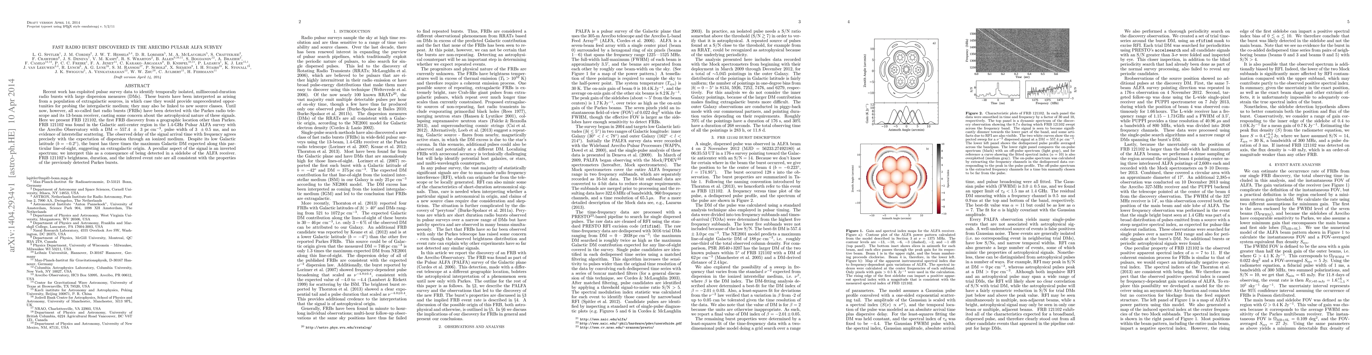 This paper reports the discovery of FRB 121102, the first fast radio burst detected outside the Parkes telescope, using the Arecibo Observatory's Pulsar ALFA survey. The burst's extragalactic origin is suggested by its high dispersion measure and inverted spectrum, indicating detection in a sidelobe.
