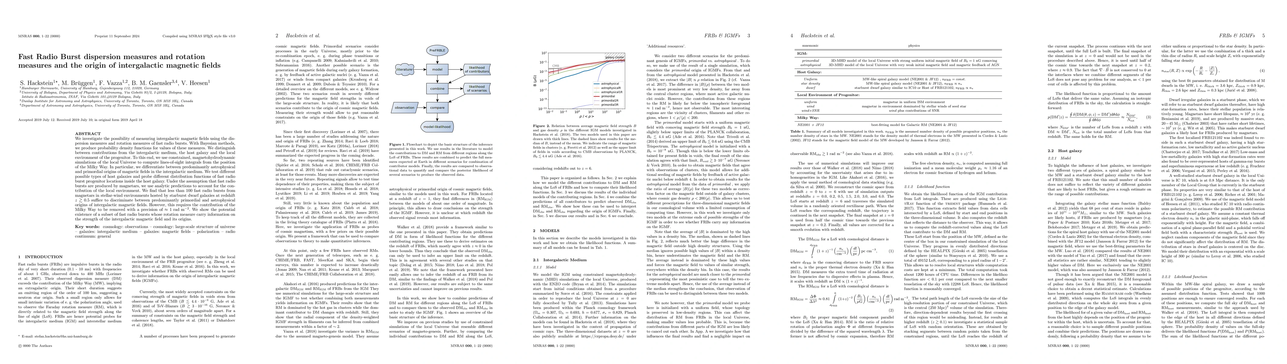 This paper explores the use of dispersion measures and rotation measures of fast radio bursts to infer the properties and origins of intergalactic magnetic fields. It finds that distinguishing between primordial and astrophysical origins requires precise measurements and the removal of Milky Way contributions, suggesting that a small number of fast radio bursts from starburst dwarf galaxies at high redshifts could provide this information.