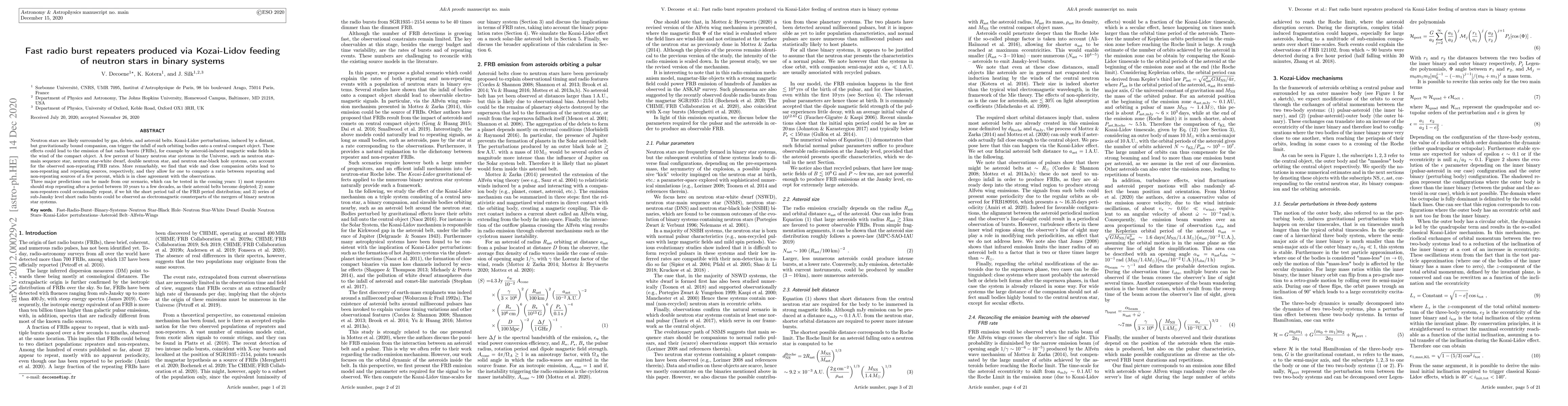 Neutron stars are likely surrounded by gas, debris, and asteroid belts. Kozai-Lidov perturbations, induced by a distant, but gravitationally bound companion, can trigger the infall of such orbiting bodies onto a central compact object. These effects could lead to the emission of fast radio bursts (FRBs), for example by asteroid-induced magnetic wake fields in the wind of the compact object. A few percent of binary neutron star systems in the Universe, such as neutron star-main sequence star, neutron star-white dwarf, double neutron star, and neutron star-black hole systems, can account for the observed non-repeating FRB rates. More remarkably, we find that wide and close companion orbits lead to non-repeating and repeating sources, respectively, and they allow for one to compute a ratio between repeating and non-repeating sources of a few percent, which is in close agreement with the observations. Three major predictions can be made from our scenario, which can be tested in the coming years: 1) most repeaters should stop repeating after a period between 10 years to a few decades, as their asteroid belts become depleted; 2) some non-repeaters could occasionally repeat, if we hit the short period tail of the FRB period distribution; and 3) series of sub-Jansky level short radio bursts could be observed as electromagnetic counterparts of the mergers of binary neutron star systems.