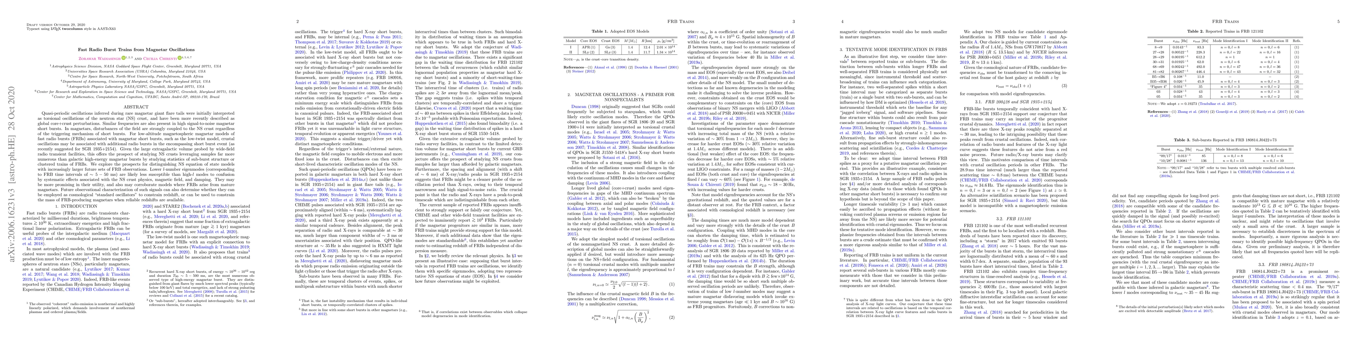 Quasi-periodic oscillations inferred during rare magnetar giant flare tails were initially interpreted as torsional oscillations of the neutron star (NS) crust, and have been more recently described as global core+crust perturbations. Similar frequencies are also present in high signal-to-noise magnetar short bursts. In magnetars, disturbances of the field are strongly coupled to the NS crust regardless of the triggering mechanism of short bursts. For low-altitude magnetospheric magnetar models of fast radio bursts (FRBs) associated with magnetar short bursts, such as the low-twist model, crustal oscillations may be associated with additional radio bursts in the encompassing short burst event (as recently suggested for SGR 1935+2154). Given the large extragalactic volume probed by wide-field radio transient facilities, this offers the prospect of studying NS crusts leveraging samples far more numerous than galactic high-energy magnetar bursts by studying statistics of sub-burst structure or clustered trains of FRBs. We explore the prospects for distinguishing NS equation of state models with increasingly larger future sets of FRB observations. Lower $l$-number eigenmodes (corresponding to FRB time intervals of $\sim5-50$ ms) are likely less susceptible than high-$l$ modes to confusion by systematic effects associated with the NS crust physics, magnetic field, and damping. They may be more promising in their utility, and also may corroborate models where FRBs arise from mature magnetars. Future observational characterization of such signals can also determine whether they can be employed as cosmological "standard oscillators" to constrain redshift, or can be used to constrain the mass of FRB-producing magnetars when reliable redshifts are available.
