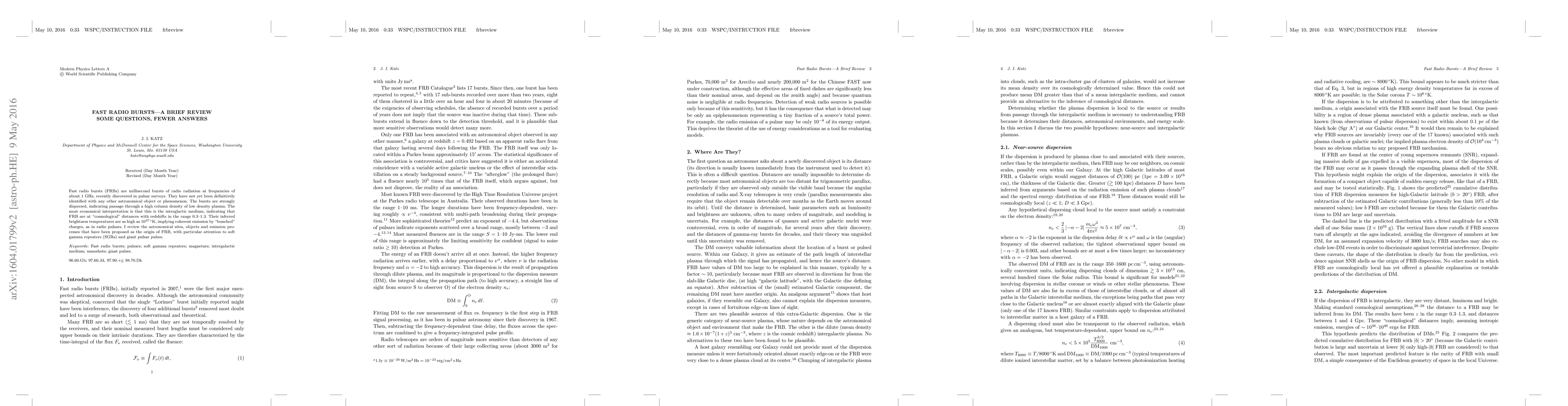 Fast Radio Bursts are millisecond bursts of radio radiation at frequencies of about 1 GHz, recently discovered in pulsar surveys. They have not yet been definitively identified with any other astronomical object or phenomenon. The bursts are strongly dispersed, indicating passage through a high column density of low density plasma. The most economical interpretation is that this is the interglactic medium, indicating that FRB are at "cosmological" distances with redshifts in the range 0.3--1.3. Their inferred brightness temperatures are as high as $10^{37\,\circ}$K, implying coherent emission by "bunched" charges, as in radio pulsars. I review the astronomical sites, objects and emission processes that have been proposed as the origin of FRB, with particular attention to Soft Gamma Repeaters and giant pulsar pulses.