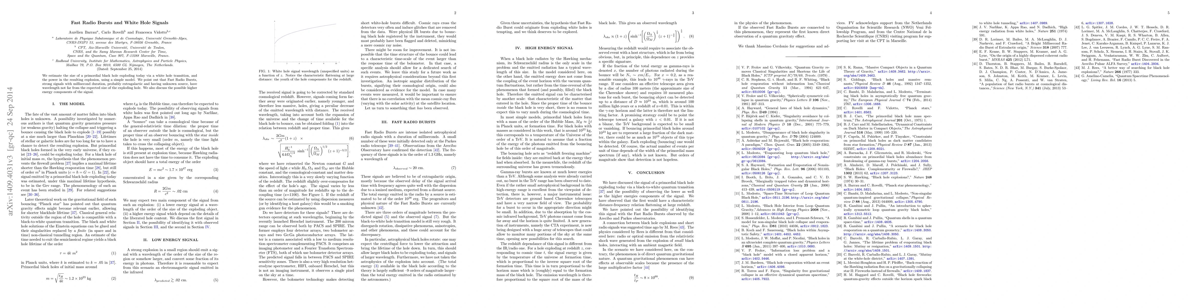 We estimate the size of a primordial black hole exploding today via a white hole transition, and the power in the resulting explosion, using a simple model. We point out that Fast Radio Bursts, strong signals with millisecond duration, probably extragalactic and having unknown source, have wavelength not far from the expected size of the exploding hole. We also discuss the possible higher energy components of the signal.