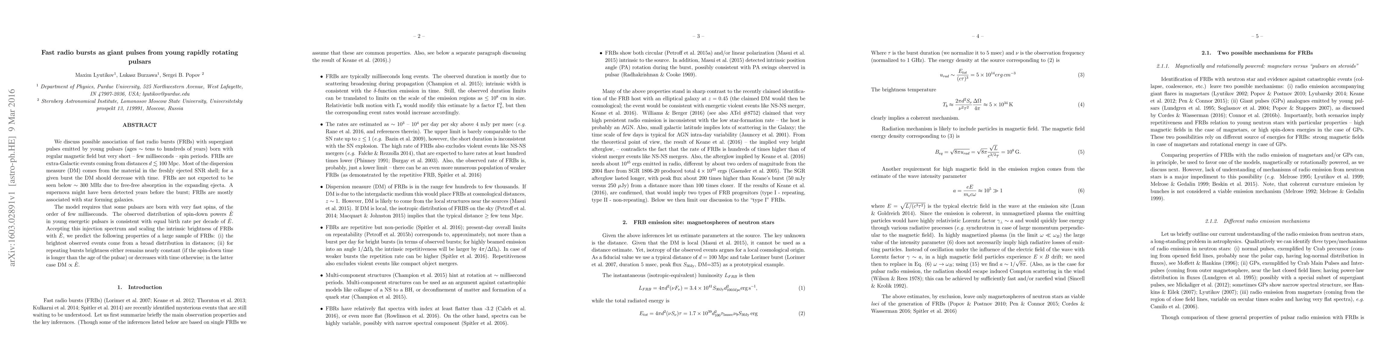 We discuss possible association of fast radio bursts (FRBs) with supergiant pulses emitted by young pulsars (ages $\sim$ tens to hundreds of years) born with regular magnetic field but very short -- few milliseconds -- spin periods. FRBs are extra-Galactic events coming from distances $d \lesssim 100$ Mpc. Most of the dispersion measure (DM) comes from the material in the freshly ejected SNR shell; for a given burst the DM should decrease with time. FRBs are not expected to be seen below $\sim 300 $ MHz due to free-free absorption in the expanding ejecta. A supernova might have been detected years before the burst; FRBs are mostly associated with star forming galaxies. The model requires that some pulsars are born with very fast spins, of the order of few milliseconds. The observed distribution of spin-down powers $\dot{E}$ in young energetic pulsars is consistent with equal birth rate per decade of $\dot{E}$. Accepting this injection spectrum and scaling the intrinsic brightness of FRBs with $\dot{E}$, we predict the following properties of a large sample of FRBs: (i) the brightest observed events come from a broad distribution in distances; (ii) for repeating bursts brightness either remains nearly constant (if the spin-down time is longer than the age of the pulsar) or decreases with time otherwise; in the latter case DM $\propto \dot{E}$.