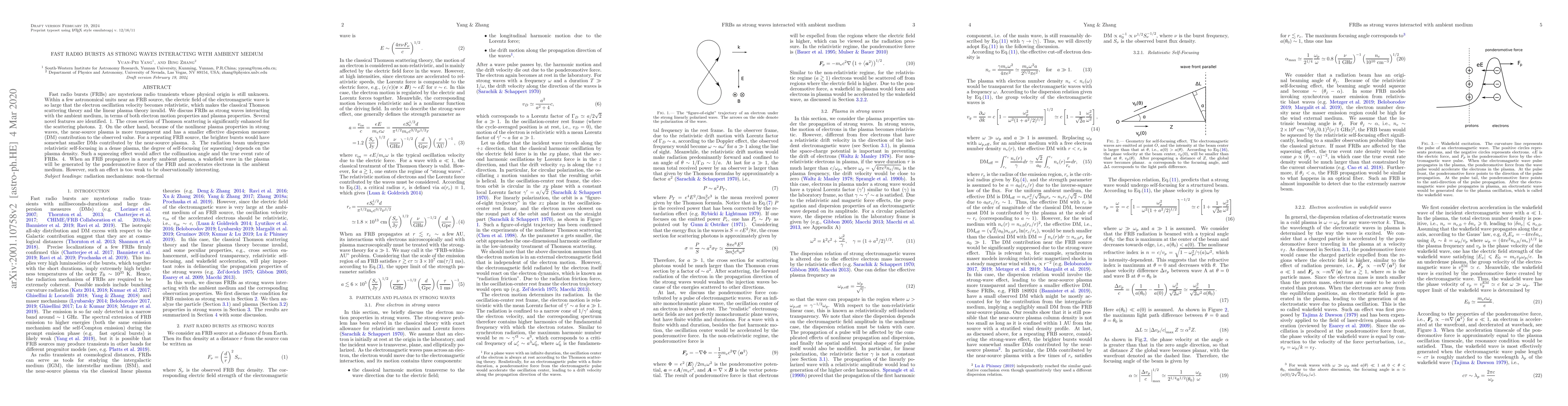 Fast radio bursts (FRBs) are studied as strong waves interacting with ambient medium, revealing new features such as enhanced Thomson scattering cross-sections and relativistic self-focusing in dense plasma.