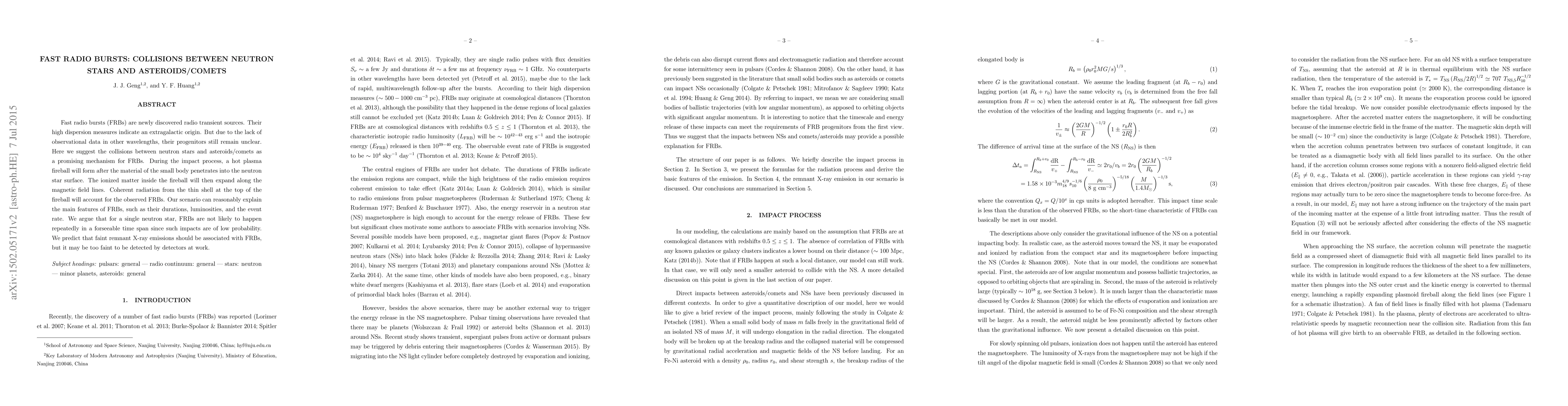 This paper proposes that collisions between neutron stars and asteroids/comets could generate fast radio bursts (FRBs) through the formation of a hot plasma fireball, which emits coherent radiation. The authors suggest that this mechanism can explain the observed characteristics of FRBs, though they note that repeated FRBs from a single neutron star are unlikely due to the low probability of such impacts.