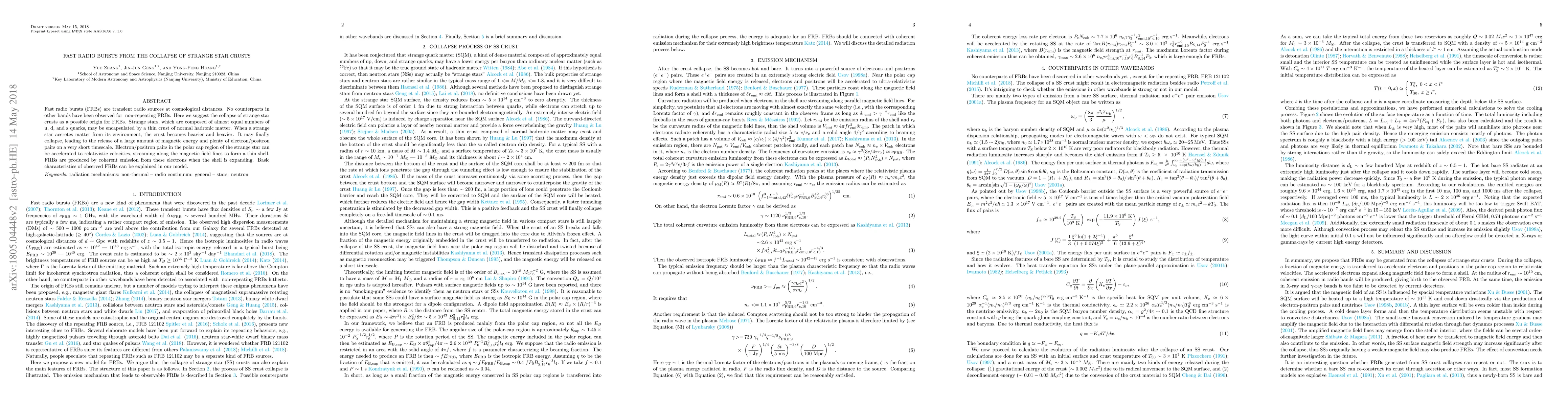 Fast Radio Bursts may originate from the collapse of strange star crusts, releasing magnetic energy that accelerates electrons to form a shell, producing coherent emission.