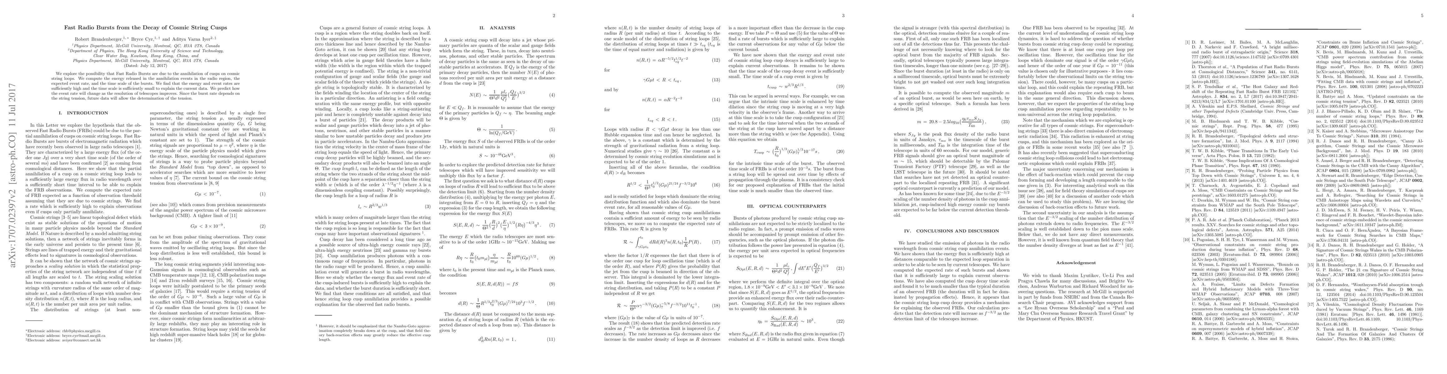 We explore the possibility that Fast Radio Bursts are due to the annihilation of cusps on cosmic string loops. We compute the energy released in the annihilation events in the radio region, the expected event rate, and the time scale of the bursts. We find that the energy and event rates are sufficiently high and the time scale is sufficiently small to explain the current data. We predict how the event rate will change as the resolution of telescopes improves. Since the burst rate depends on the string tension, future data will allow the determination of the tension.