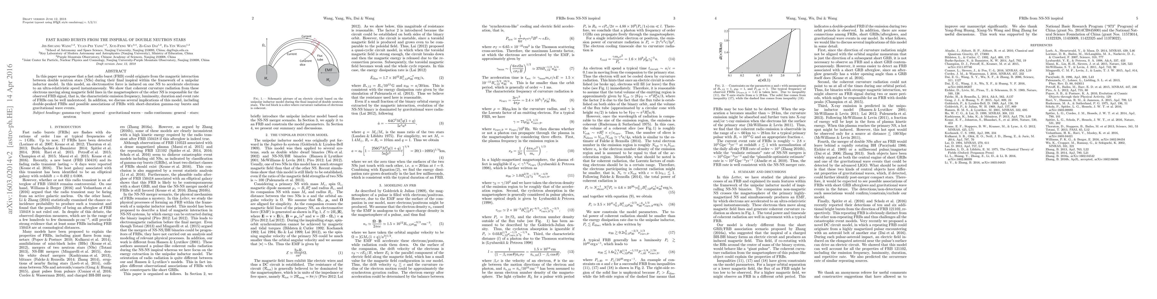 In this paper we propose that a fast radio burst (FRB) could originate from the magnetic interaction between double neutron stars (NSs) during their final inspiral within the framework of a unipolar inductor model. In this model, an electromotive force is induced on one NS to accelerate electrons to an ultra-relativistic speed instantaneously. We show that coherent curvature radiation from these electrons moving along magnetic field lines in the magnetosphere of the other NS is responsible for the observed FRB signal, that is, the characteristic emission frequency, luminosity, duration and event rate of FRBs can be well understood. In addition, we discuss several implications of this model, including double-peaked FRBs and possible associations of FRBs with short-duration gamma-ray bursts and gravitational wave events.