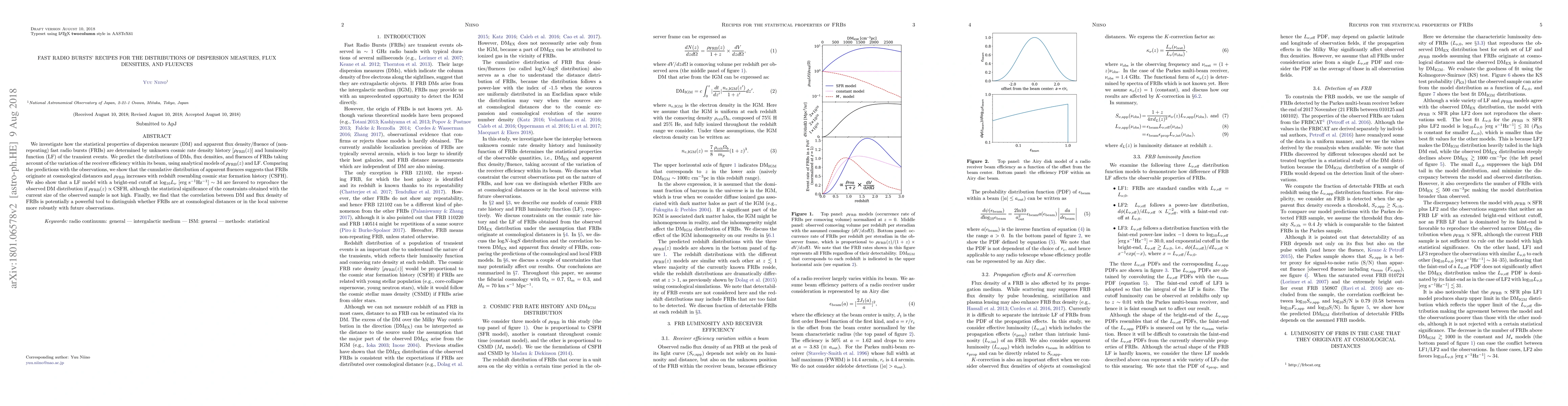 This paper investigates the statistical properties of fast radio bursts (FRBs) and predicts the distributions of their dispersion measures, flux densities, and fluences. It concludes that the observed fluence distribution suggests FRBs originate at cosmological distances with a rate density increasing with redshift, aligning with the cosmic star formation history. The study also finds that a luminosity function model with a cutoff is favored for explaining the observed dispersion measure distribution.