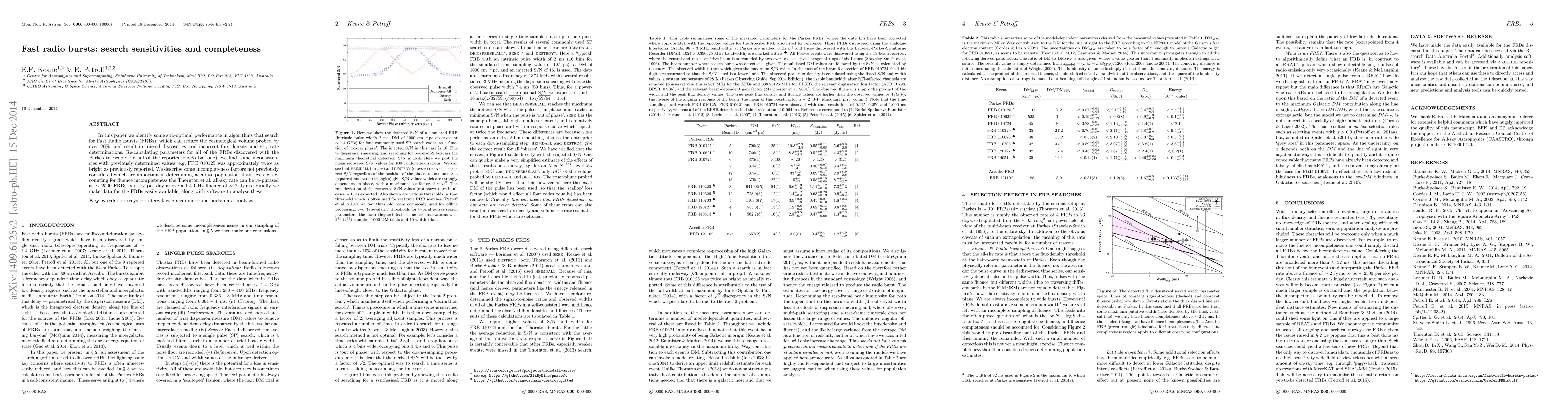 In this paper we identify some sub-optimal performance in algorithms that search for Fast Radio Bursts (FRBs), which can reduce the cosmological volume probed by over 20%, and result in missed discoveries and incorrect flux density and sky rate determinations. Re-calculating parameters for all of the FRBs discovered with the Parkes telescope (i.e. all of the reported FRBs bar one), we find some inconsistencies with previously determined values, e.g. FRB 010125 was approximately twice as bright as previously reported. We describe some incompleteness factors not previously considered which are important in determining accurate population statistics, e.g. accounting for fluence incompleteness the Thornton et al. all-sky rate can be re-phrased as ~2500 FRBs per sky per day above a 1.4-GHz fluence of ~2 Jy ms. Finally we make data for the FRBs easily available, along with software to analyse these.