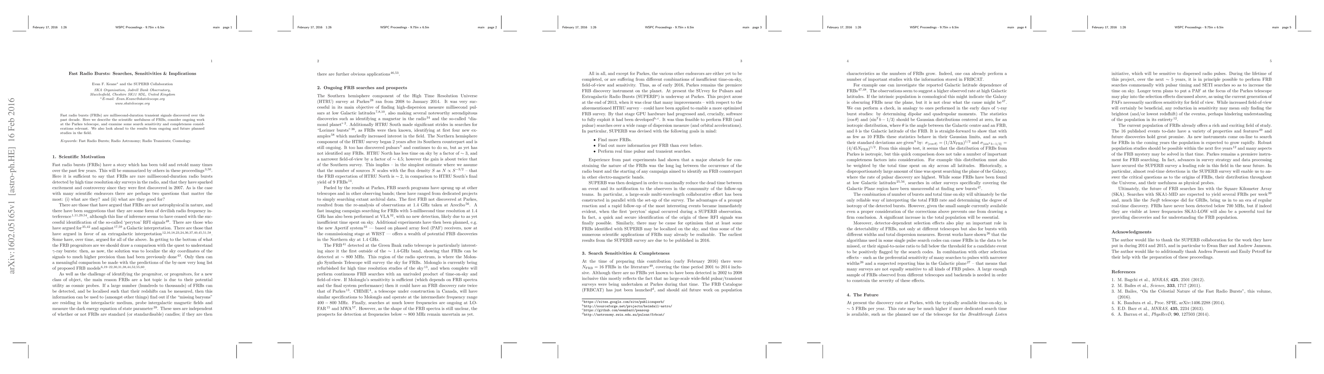 This paper explores the scientific significance of Fast Radio Bursts (FRBs), their search sensitivity, and future studies in the field, highlighting ongoing work at the Parkes telescope and its implications for understanding these millisecond-duration transient signals.