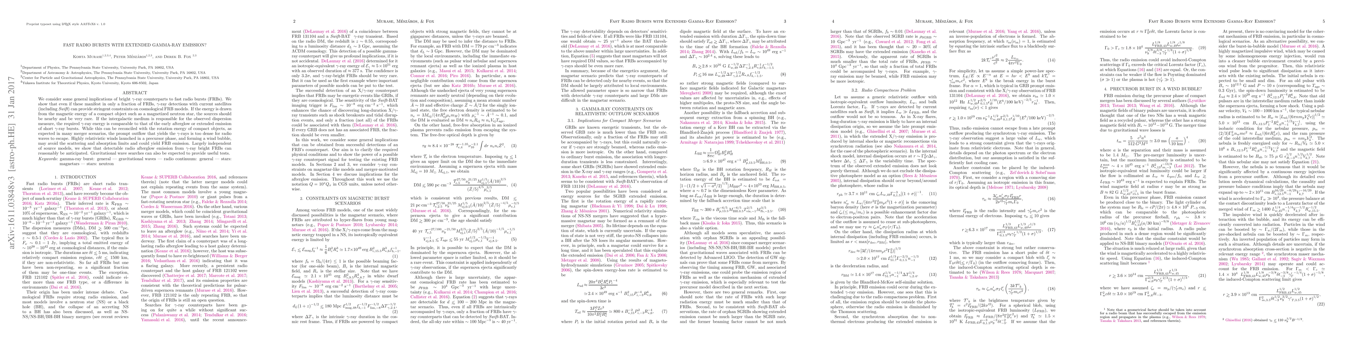 We consider some general implications of bright gamma-ray counterparts to fast radio bursts (FRBs). We show that even if these manifest in only a fraction of FRBs, gamma-ray detections with current satellites (including Swift) can provide stringent constraints on cosmological FRB models. If the energy is drawn from the magnetic energy of a compact object such as a magnetized neutron star, the sources should be nearby and be very rare. If the intergalactic medium is responsible for the observed dispersion measure, the required gamma-ray energy is comparable to that of the early afterglow or extended emission of short gamma-ray bursts. While this can be reconciled with the rotation energy of compact objects, as expected in many merger scenarios, the prompt outflow that yields the gamma-rays is too dense for radio waves to escape. Highly relativistic winds launched in a precursor phase, and forming a wind bubble, may avoid the scattering and absorption limits and could yield FRB emission. Largely independent of source models, we show that detectable radio afterglow emission from gamma-ray bright FRBs can reasonably be anticipated. Gravitational wave searches can also be expected to provide useful tests.