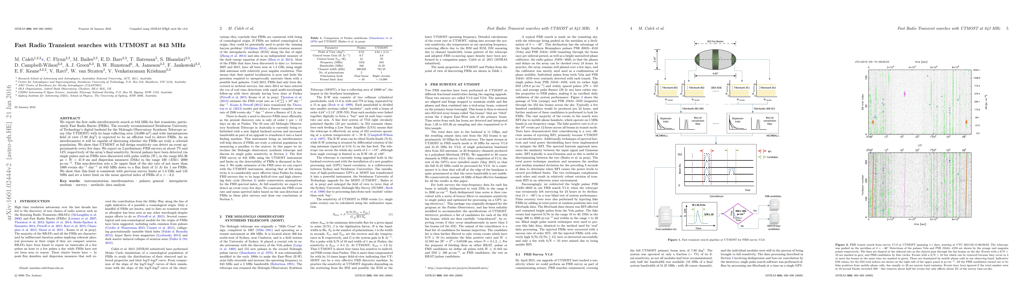 We report the first radio interferometric search at 843 MHz for fast transients, particularly Fast Radio Bursts (FRBs). The recently recommissioned Swinburne University of Technology's digital backend for the Molonglo Observatory Synthesis Telescope array (the UTMOST) with its large collecting area (18,000 $\mathrm{m^2}$) and wide instantaneous field of view (7.80 $\mathrm{deg^2}$) is expected to be an efficient tool to detect FRBs. As an interferometer it will be capable of discerning whether the FRBs are truly a celestial population. We show that UTMOST at full design sensitivity can detect an event approximately every few days. We report on 2 preliminary FRB surveys at about 7% and 14% respectively of the array's final sensitivity. Several pulsars have been detected via single pulses and no FRBs were discovered with pulse widths ($W$), in the range 655.36 $\mu$s $< W < 41.9$ ms and dispersion measures (DMs) in the range $100 < $DM$< 2000$ $\mathrm{pc\,cm^{-3}}$. This non-detection sets a 2$\sigma$ upper limit of the sky rate of not more than 1000 events $\mathrm{sky^{-1}}$ $\mathrm{day^{-1}}$ at 843 MHz down to a flux limit of 11 Jy for 1 ms FRBs. We show that this limit is consistent with previous survey limits at 1.4 GHz and 145 MHz and set a lower limit on the mean spectral index of FRBs of $\alpha > -3.2$.