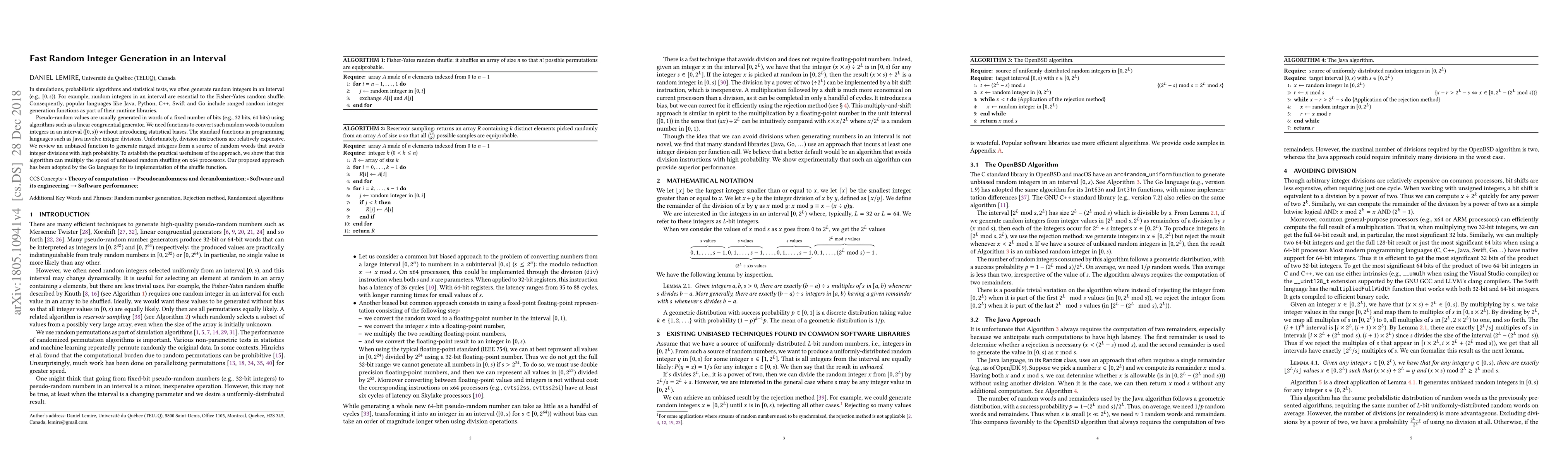 This paper proposes an efficient method to generate unbiased random integers in a specified interval without using integer divisions, which are costly. The new approach significantly speeds up unbiased random shuffling on x64 processors and has been adopted by the Go language for its shuffle function implementation.