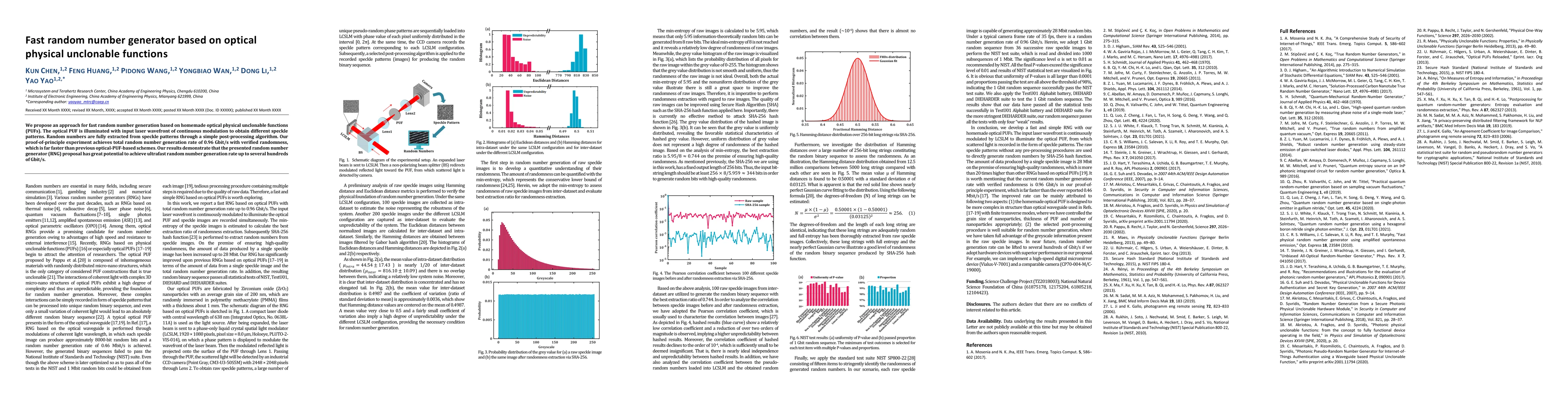 This paper proposes a fast random number generator using optical physical unclonable functions (PUFs) that generate random numbers from speckle patterns illuminated by a continuous modulation laser. The method achieves a generation rate of 0.96 Gbit/s, significantly faster than previous optical-PUF-based schemes, with potential for even higher speeds.