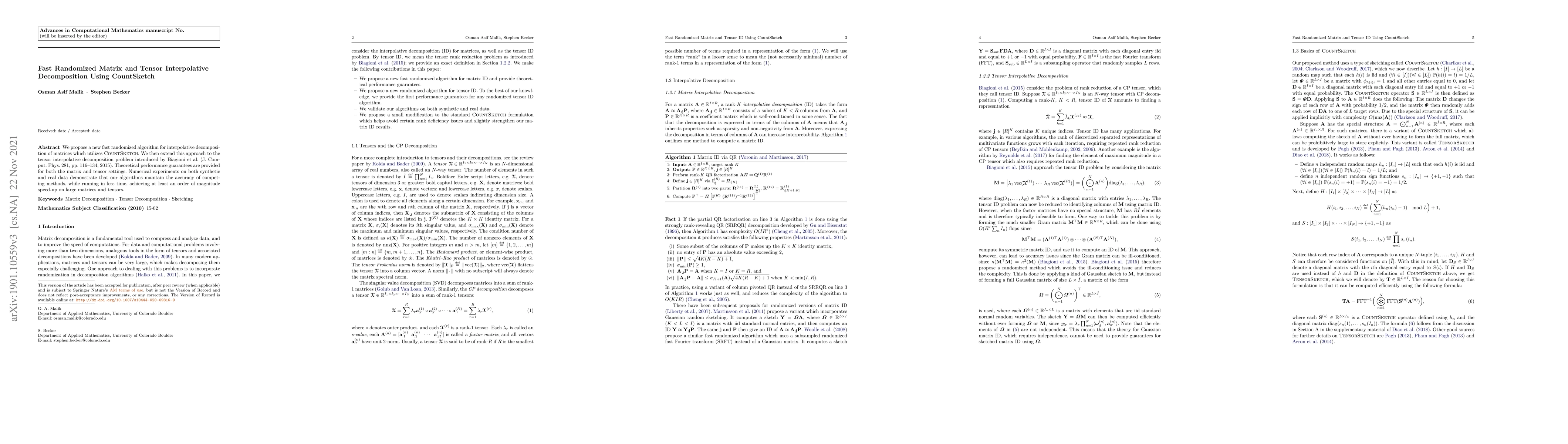 This paper introduces a fast randomized algorithm for interpolative decomposition using CountSketch, achieving significant speed-ups over existing methods while maintaining accuracy. The approach is extended to tensor interpolative decomposition, with theoretical guarantees and empirical validation on both synthetic and real data.