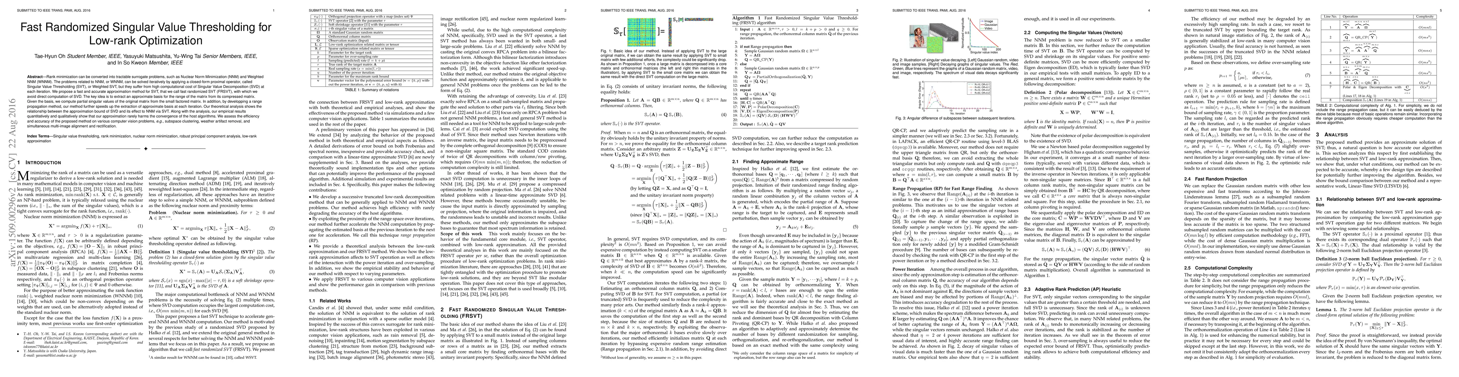 Rank minimization can be converted into tractable surrogate problems, such as Nuclear Norm Minimization (NNM) and Weighted NNM (WNNM). The problems related to NNM, or WNNM, can be solved iteratively by applying a closed-form proximal operator, called Singular Value Thresholding (SVT), or Weighted SVT, but they suffer from high computational cost of Singular Value Decomposition (SVD) at each iteration. We propose a fast and accurate approximation method for SVT, that we call fast randomized SVT (FRSVT), with which we avoid direct computation of SVD. The key idea is to extract an approximate basis for the range of the matrix from its compressed matrix. Given the basis, we compute partial singular values of the original matrix from the small factored matrix. In addition, by developping a range propagation method, our method further speeds up the extraction of approximate basis at each iteration. Our theoretical analysis shows the relationship between the approximation bound of SVD and its effect to NNM via SVT. Along with the analysis, our empirical results quantitatively and qualitatively show that our approximation rarely harms the convergence of the host algorithms. We assess the efficiency and accuracy of the proposed method on various computer vision problems, e.g., subspace clustering, weather artifact removal, and simultaneous multi-image alignment and rectification.
