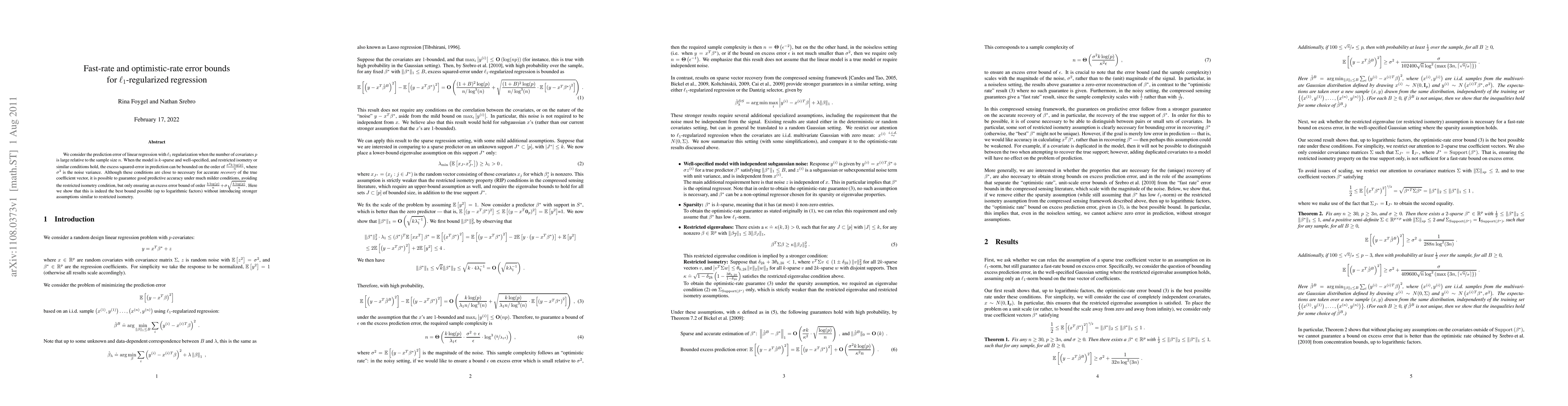 We consider the prediction error of linear regression with L1 regularization when the number of covariates p is large relative to the sample size n. When the model is k-sparse and well-specified, and restricted isometry or similar conditions hold, the excess squared-error in prediction can be bounded on the order of sigma^2*(k*log(p)/n), where sigma^2 is the noise variance. Although these conditions are close to necessary for accurate recovery of the true coefficient vector, it is possible to guarantee good predictive accuracy under much milder conditions, avoiding the restricted isometry condition, but only ensuring an excess error bound of order (k*log(p)/n)+sigma*\surd(k*log(p)/n). Here we show that this is indeed the best bound possible (up to logarithmic factors) without introducing stronger assumptions similar to restricted isometry.