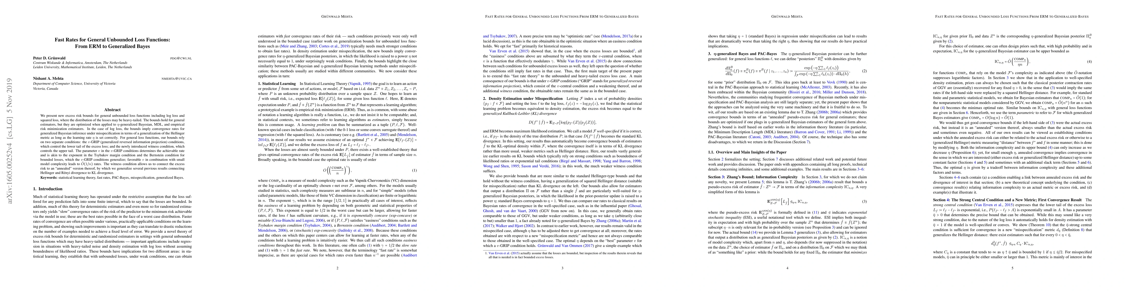 We present new excess risk bounds for general unbounded loss functions including log loss and squared loss, where the distribution of the losses may be heavy-tailed. The bounds hold for general estimators, but they are optimized when applied to $\eta$-generalized Bayesian, MDL, and empirical risk minimization estimators. In the case of log loss, the bounds imply convergence rates for generalized Bayesian inference under misspecification in terms of a generalization of the Hellinger metric as long as the learning rate $\eta$ is set correctly. For general loss functions, our bounds rely on two separate conditions: the $v$-GRIP (generalized reversed information projection) conditions, which control the lower tail of the excess loss; and the newly introduced witness condition, which controls the upper tail. The parameter $v$ in the $v$-GRIP conditions determines the achievable rate and is akin to the exponent in the Tsybakov margin condition and the Bernstein condition for bounded losses, which the $v$-GRIP conditions generalize; favorable $v$ in combination with small model complexity leads to $\tilde{O}(1/n)$ rates. The witness condition allows us to connect the excess risk to an "annealed" version thereof, by which we generalize several previous results connecting Hellinger and R\'enyi divergence to KL divergence.