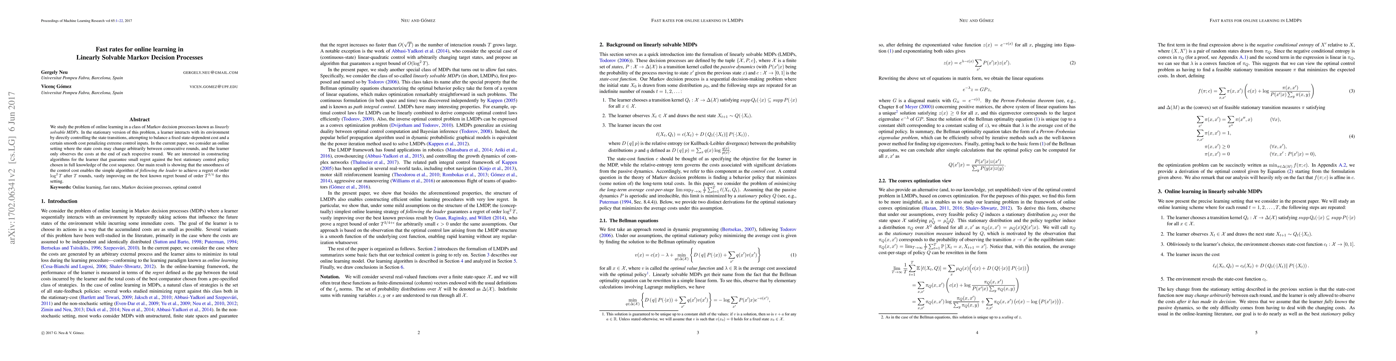 This paper investigates online learning algorithms for linearly solvable Markov decision processes, focusing on achieving small regret against the best stationary policy. It demonstrates that following the leader strategy can achieve a regret of order $\log^2 T$, significantly improving upon previous $T^{3/4}$ bounds.