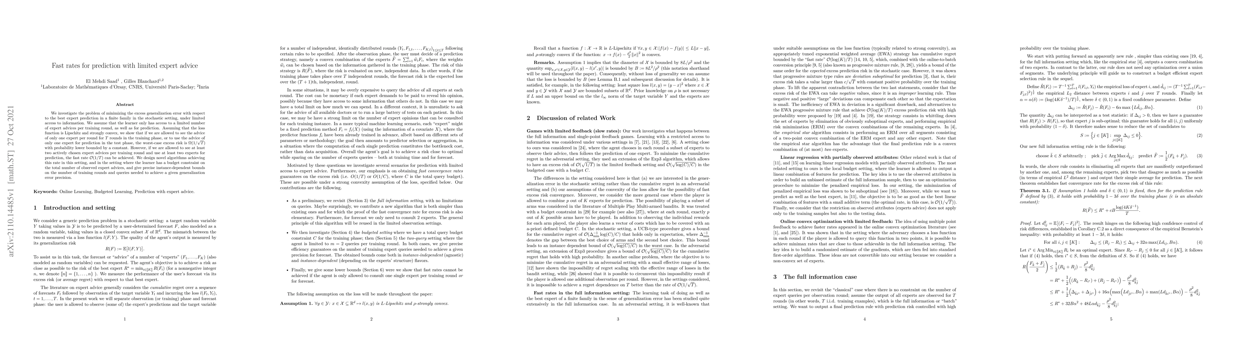 This paper examines strategies for minimizing generalization error when limited expert advice is available, showing that using only one expert per round results in an $\Omega$(1/ $\sqrt$ T) rate, but leveraging at least two experts can achieve the faster O(1/T) rate. Novel algorithms are proposed to meet these rates under various constraints.