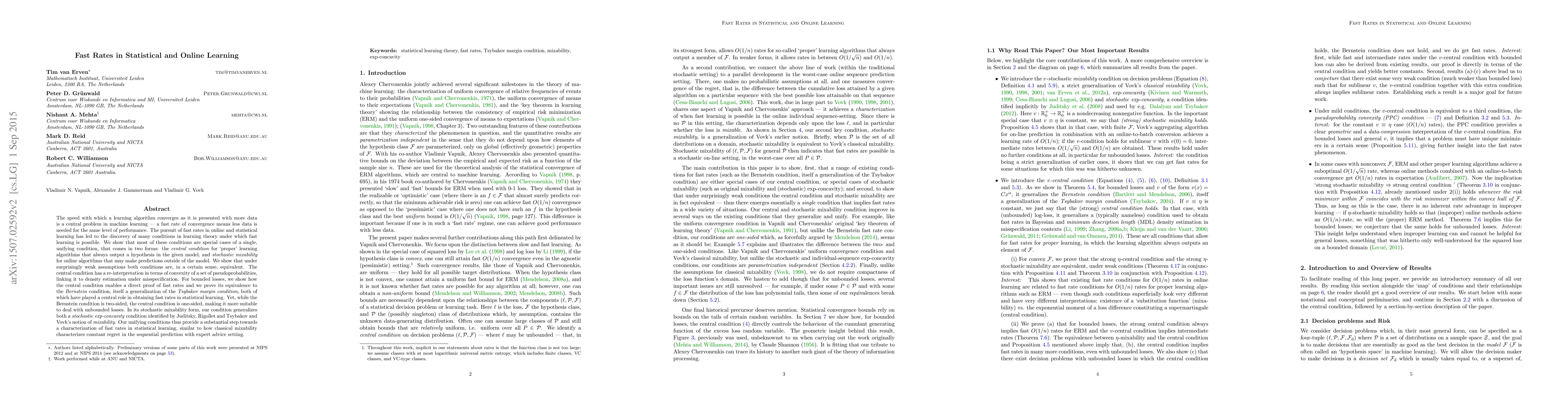 This paper presents a unifying condition for fast convergence rates in both statistical and online learning, identifying two forms: the central condition for proper learning algorithms and stochastic mixability for online algorithms. It demonstrates the equivalence of these conditions under weak assumptions and links them to convexity and density estimation, providing a comprehensive framework for achieving fast learning rates.