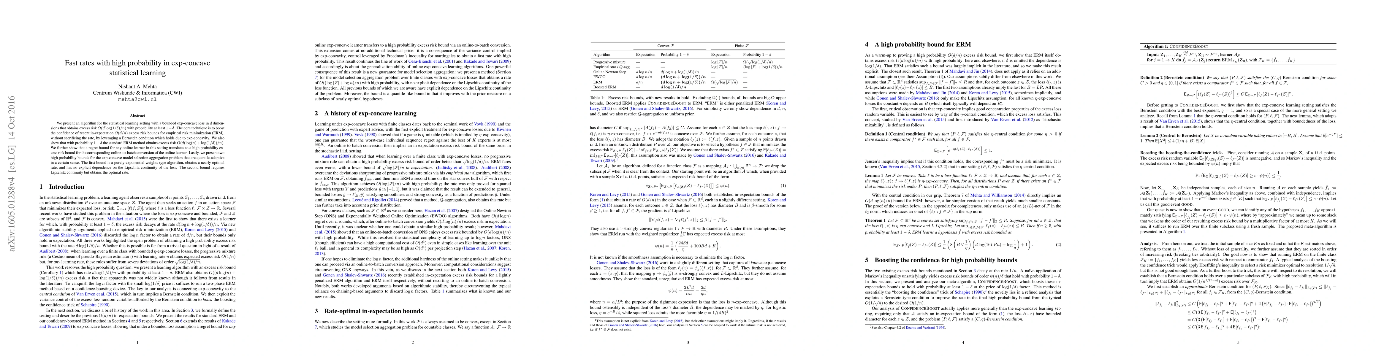 This paper introduces an algorithm achieving fast rates with high probability for exp-concave loss in statistical learning, improving upon in-expectation bounds through a Bernstein condition. It also presents high probability bounds for model selection and online-to-batch conversion, with one nearly optimal and the other optimal under Lipschitz continuity.