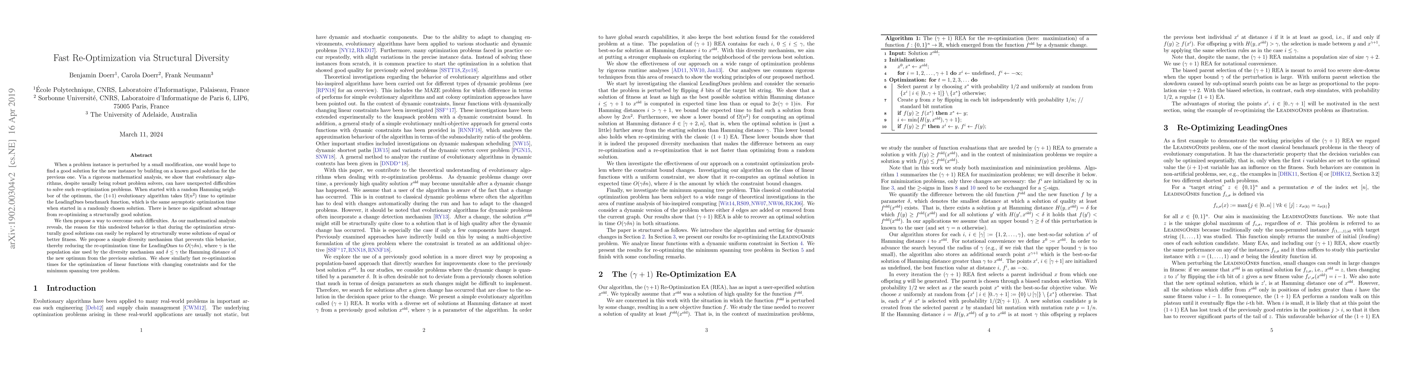 A research paper finds that evolutionary algorithms can struggle to re-optimize a solution after making small changes, but proposes a diversity mechanism to overcome this issue, resulting in faster re-optimization times.