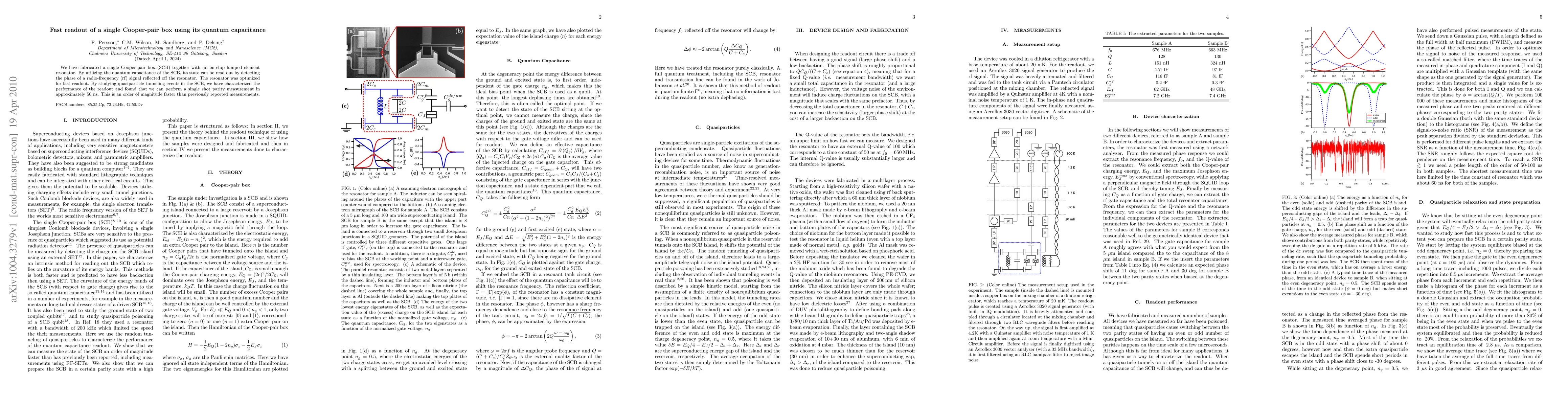 This paper presents a fast readout method for a single Cooper-pair box (SCB) utilizing its quantum capacitance, achieving a single shot parity measurement in about 50 ns by detecting the phase of a reflected radio-frequency signal from an optimized resonator, significantly outperforming previous techniques.