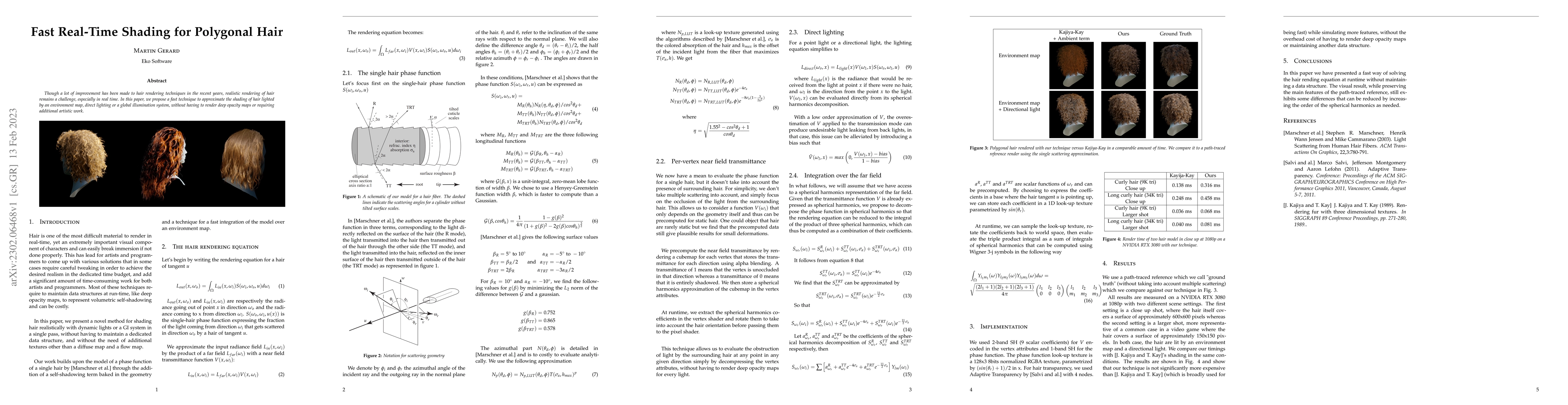 This paper presents a fast real-time shading technique for polygonal hair that approximates lighting from environment maps, direct light, or global illumination without deep opacity maps or extra artistic effort. The method aims to enhance realistic rendering of hair in real-time applications.