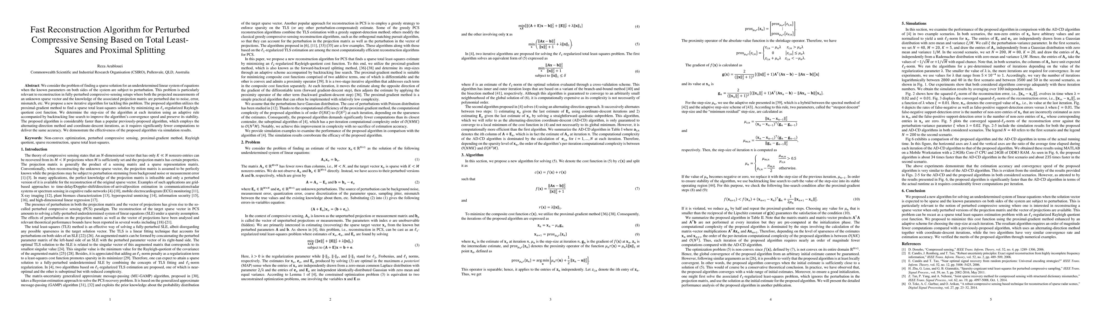 This paper proposes a fast iterative reconstruction algorithm for perturbed compressive sensing using total least-squares and proximal splitting. The algorithm leverages an adaptive step-size and backtracking line search to enhance convergence speed and stability, outperforming previous methods in computational efficiency while maintaining accuracy.