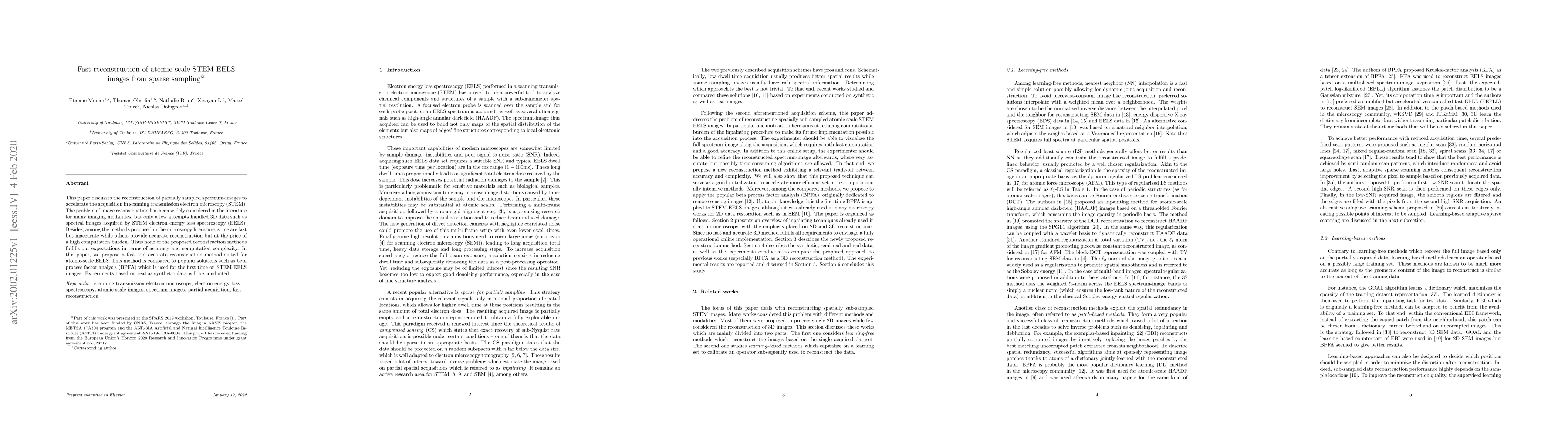 This paper proposes a fast and accurate reconstruction method for atomic-scale scanning transmission electron microscopy (STEM) electron energy loss spectroscopy (EELS) images from sparse sampling. The method is compared to beta process factor analysis (BPFA) and aims to balance accuracy and computational efficiency.