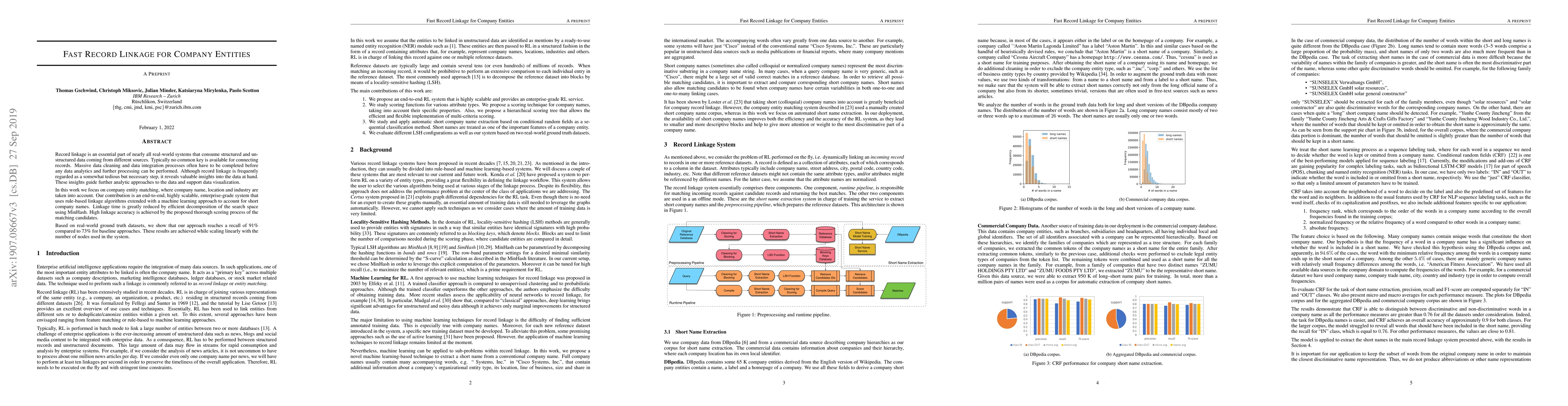 Record linkage is an essential part of nearly all real-world systems that consume structured and unstructured data coming from different sources. Typically no common key is available for connecting records. Massive data cleaning and data integration processes often have to be completed before any data analytics and further processing can be performed. Although record linkage is frequently regarded as a somewhat tedious but necessary step, it reveals valuable insights into the data at hand. These insights guide further analytic approaches to the data and support data visualization. In this work we focus on company entity matching, where company name, location and industry are taken into account. Our contribution is an end-to-end, highly scalable, enterprise-grade system that uses rule-based linkage algorithms extended with a machine learning approach to account for short company names. Linkage time is greatly reduced by efficient decomposition of the search space using MinHash. High linkage accuracy is achieved by the proposed thorough scoring process of the matching candidates. Based on real-world ground truth datasets, we show that our approach reaches a recall of 91% compared to 73% for baseline approaches. These results are achieved while scaling linearly with the number of nodes used in the system.