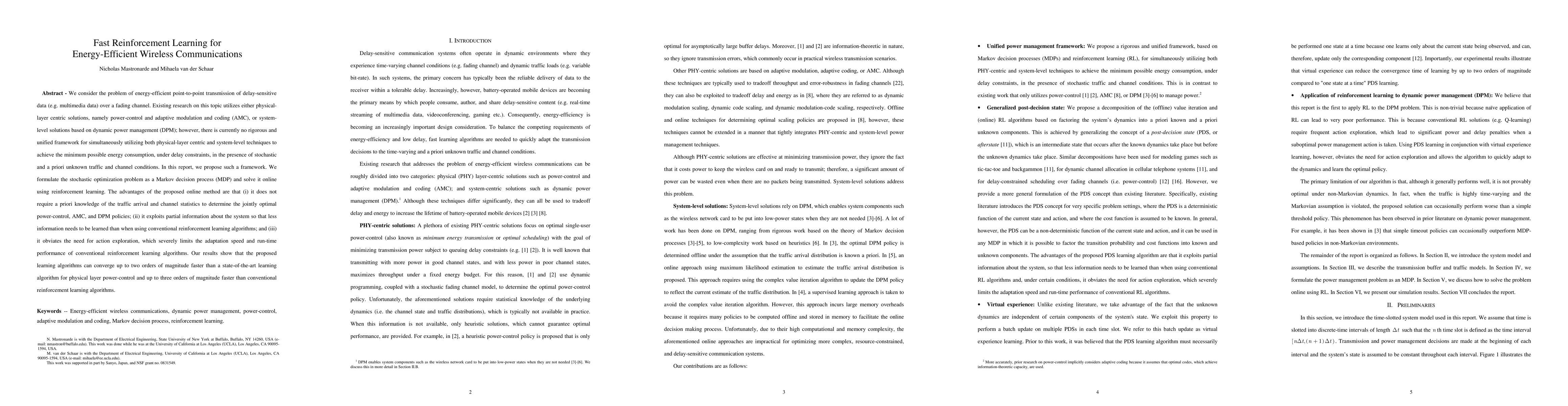 A new framework for energy-efficient wireless communications uses reinforcement learning to optimize power-control, adaptive modulation and coding, and dynamic power management simultaneously, achieving significant speedup over existing methods.