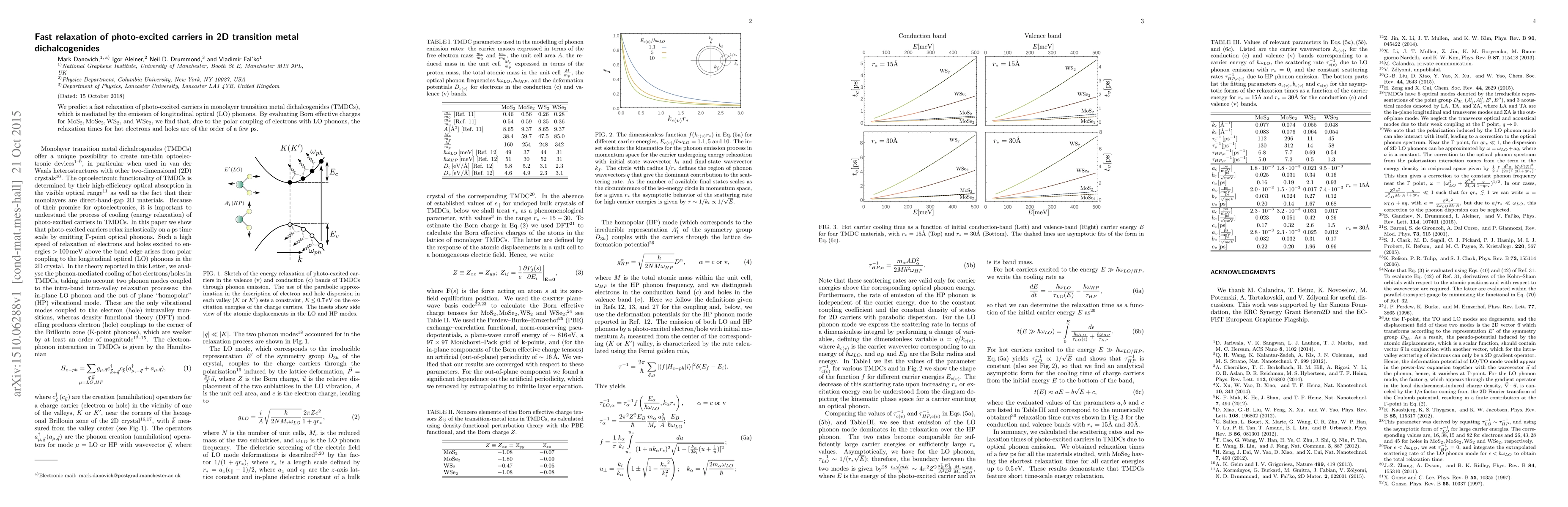 Researchers predict that photo-excited carriers in 2D transition metal dichalcogenides relax quickly, on the order of a few ps, due to emission of longitudinal optical phonons. This fast relaxation is key to understanding the behavior of hot electrons and holes in these materials.