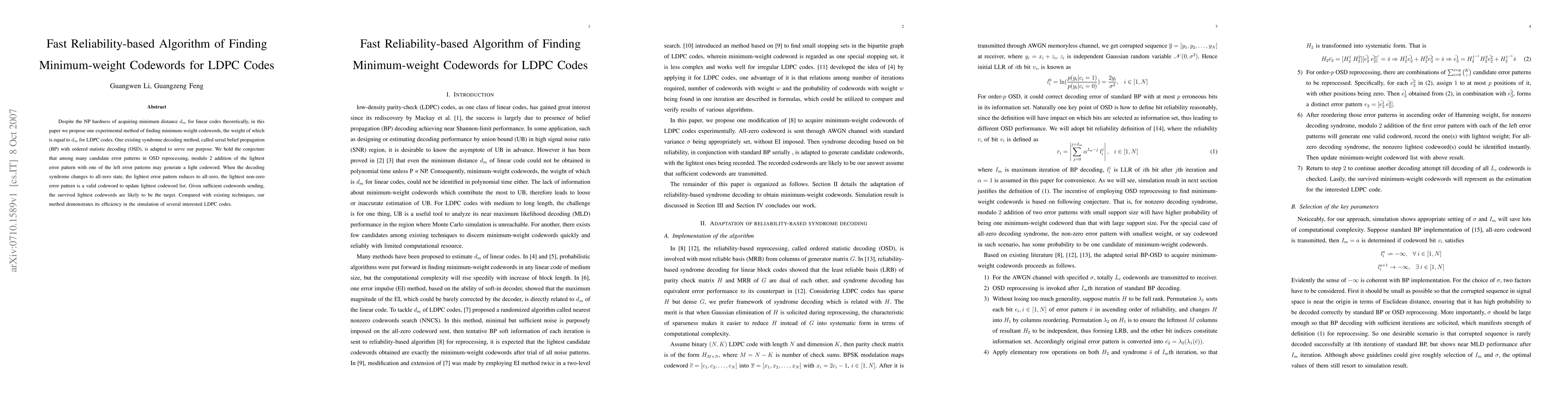 This paper proposes an experimental method to find minimum-weight codewords for LDPC codes using a modified serial belief propagation with ordered statistic decoding. The method conjectures that combining the lightest error pattern with other error patterns can yield a lighter codeword, and it demonstrates efficiency in simulations compared to existing techniques.
