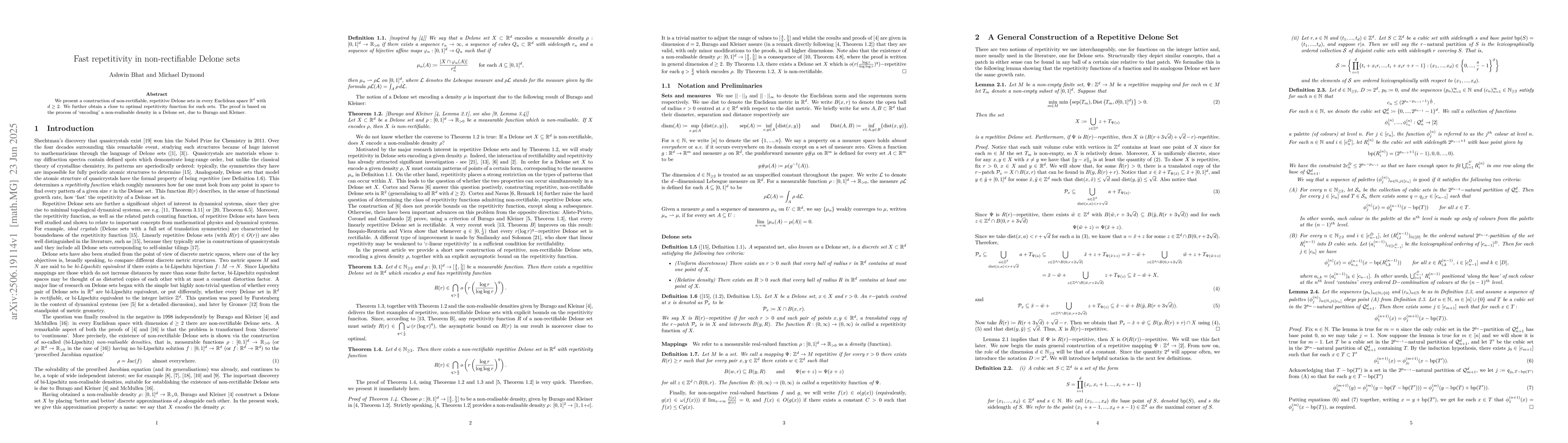 We present a construction of non-rectifiable, repetitive Delone sets in every Euclidean space $\mathbb{R}^d$ with $d \geq 2$. We further obtain a close to optimal repetitivity function for such sets. The proof is based on the process of encoding a non-realisable density in a Delone set, due to Burago and Kleiner.