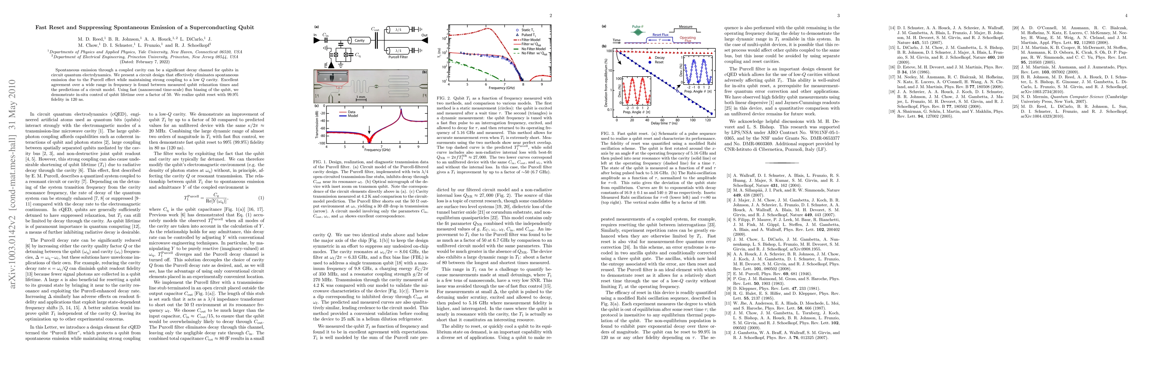 This paper presents a circuit design that suppresses spontaneous emission in superconducting qubits via the Purcell effect, achieving strong coupling to a low-Q cavity. The authors demonstrate in situ control of qubit lifetime by a factor of 50 and achieve qubit reset with 99.9% fidelity in 120 ns using fast flux biasing.
