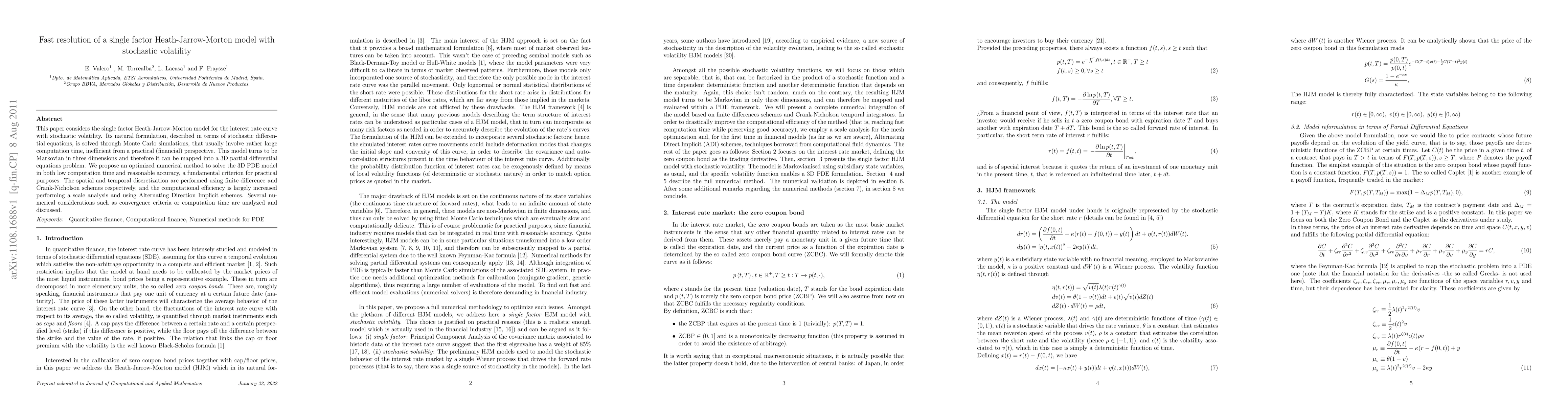 This paper considers the single factor Heath-Jarrow-Morton model for the interest rate curve with stochastic volatility. Its natural formulation, described in terms of stochastic differential equations, is solved through Monte Carlo simulations, that usually involve rather large computation time, inefficient from a practical (financial) perspective. This model turns to be Markovian in three dimensions and therefore it can be mapped into a 3D partial differential equations problem. We propose an optimized numerical method to solve the 3D PDE model in both low computation time and reasonable accuracy, a fundamental criterion for practical purposes. The spatial and temporal discretization are performed using finite-difference and Crank-Nicholson schemes respectively, and the computational efficiency is largely increased performing a scale analysis and using Alternating Direction Implicit schemes. Several numerical considerations such as convergence criteria or computation time are analyzed and discussed.
