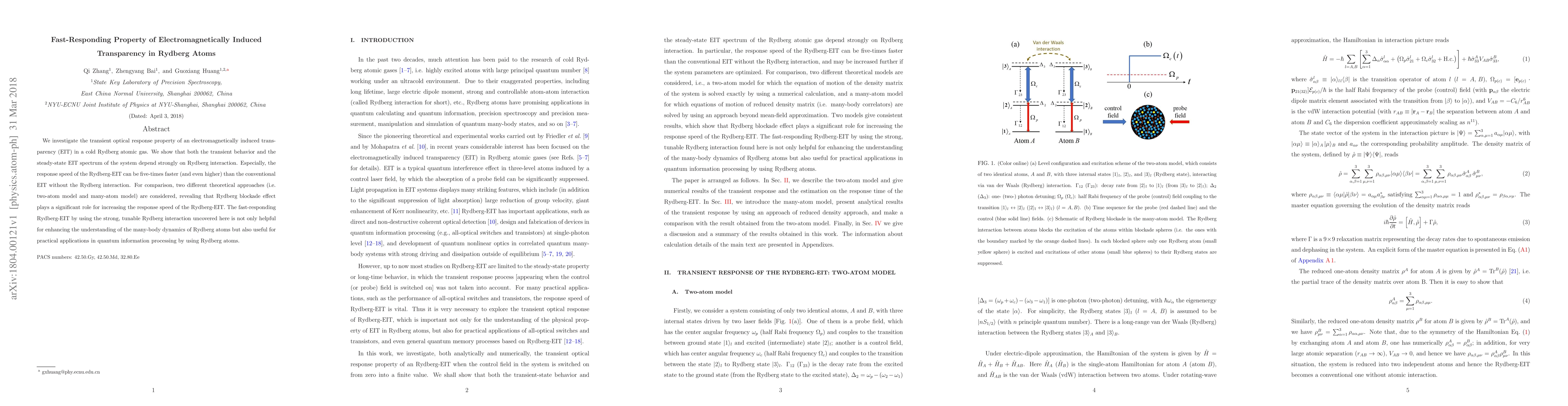 This study explores the fast-responding property of electromagnetically induced transparency (EIT) in Rydberg atomic gases, demonstrating that Rydberg interaction significantly enhances the response speed up to five times faster than conventional EIT. Theoretical models reveal the Rydberg blockade effect as a key factor, with implications for quantum information processing.