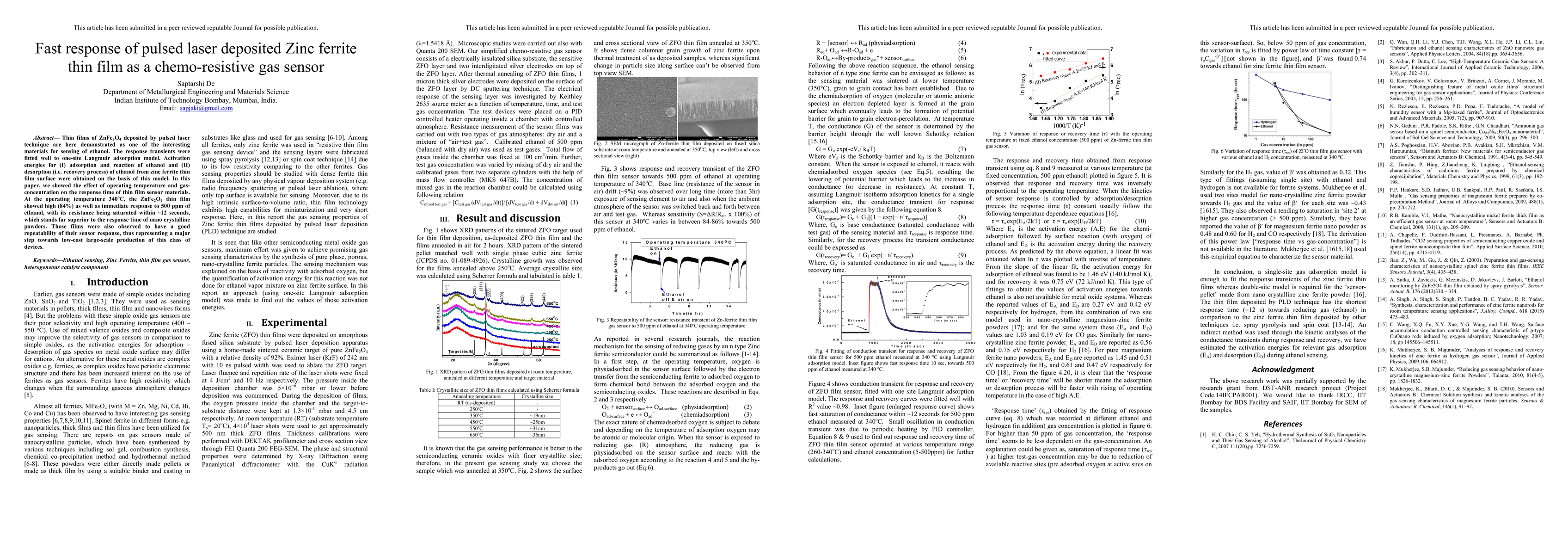 This paper demonstrates pulsed laser deposited ZnFe2O4 thin films as efficient chemo-resistive ethanol sensors, showing an 84% response to 500 ppm ethanol at 340°C within 12 seconds, with good repeatability and potential for large-scale production. The response is modeled using a one-site Langmuir adsorption model.